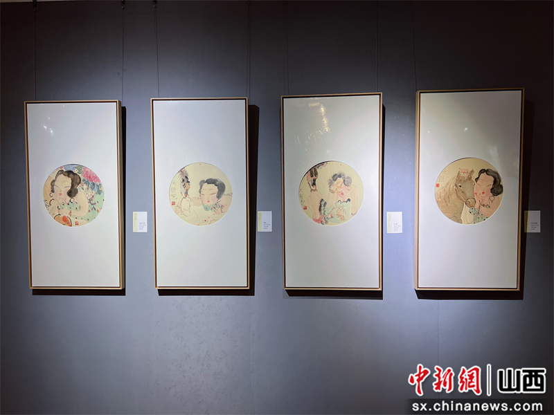 图为李旺教授作品。《持扇美人图》(左一)、《晨妆》、《嬉鸟图》、《美女爱马图》 栗雨琪 摄