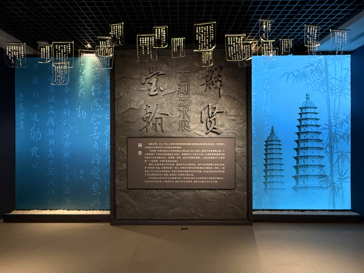 展览通过“翰墨渊薮”“墨舞笔韵”“法墨新规”三个单元,展示了宝贤堂法帖的历史渊源、艺术特点与文化价值。展览共计展品67件。其中,明、清原石5通,明、清拓本16件,拓片36件,复制碑4通,出版物6件。原石、拓本与拓片相互映衬,辅以高清数字影像、互动体验及文创展示等多元手段。