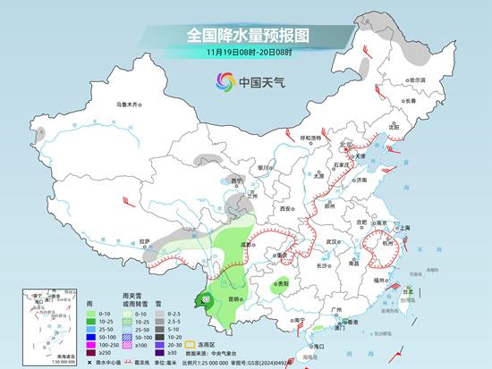 昨天,随着寒潮南下,干冷气团向南推进,长江沿线降水停歇,雨雪天气主要集中在西南到华南一带,云南、广西部分地区雨势较强。监测显示,18日8时至19日6时,青海南部、西藏东部、云南东北部、四川甘孜东部、黑龙江东部等地部分地区出现小雪或雨夹雪;重庆南部、云南中南部、广西中南部及台湾岛北部出现中到大雨,局地暴雨,台湾岛北部局地大暴雨。
