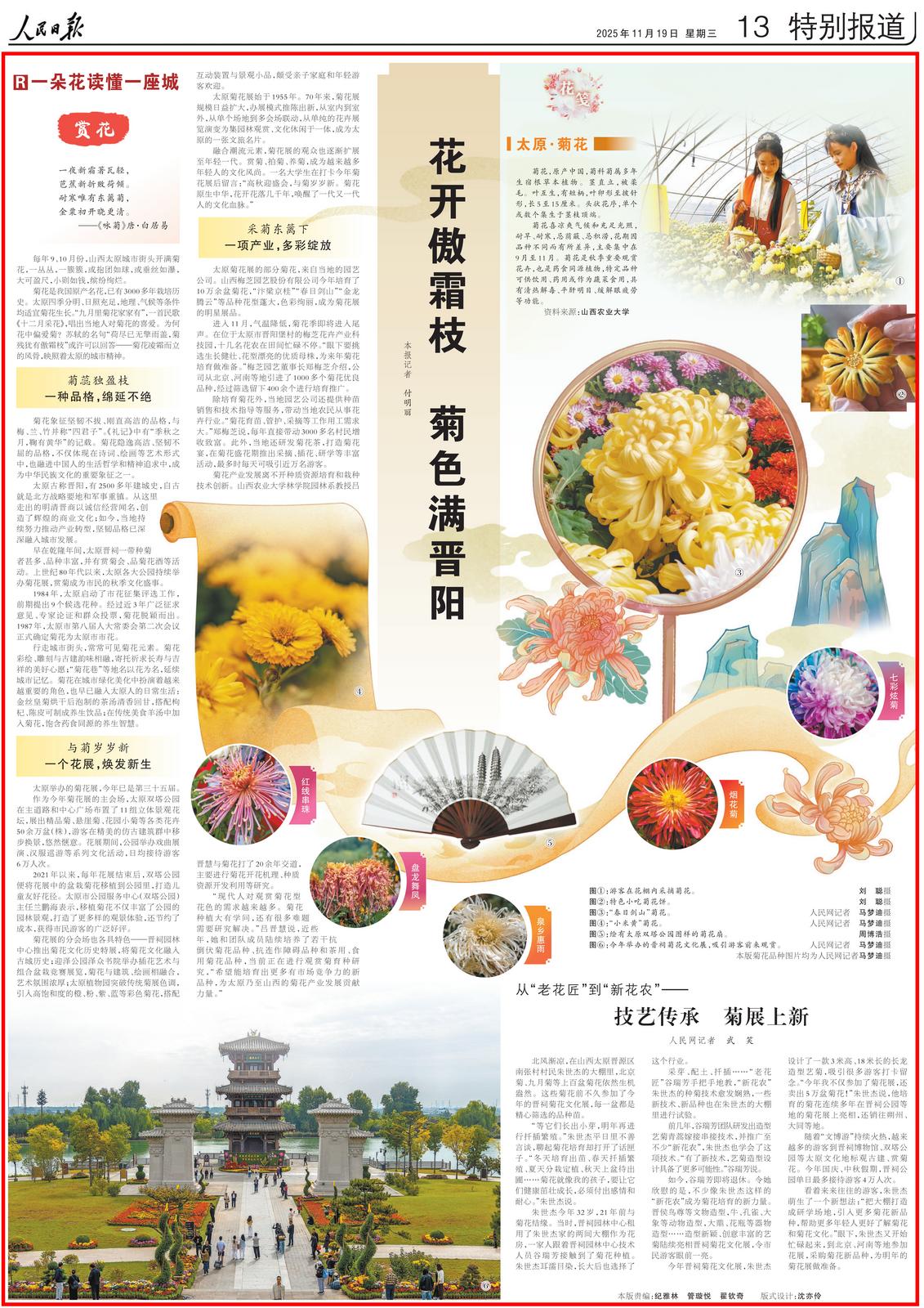 菊花是我国原产名花,已有3000多年栽培历史。太原四季分明、日照充足,地理、气候等条件均适宜菊花生长。“九月里菊花家家有”,一首民歌《十二月采花》,唱出当地人对菊花的喜爱。为何花中偏爱菊?苏轼的名句“荷尽已无擎雨盖,菊残犹有傲霜枝”或许可以回答——菊花凌霜而立的风骨,映照着太原的城市精神。