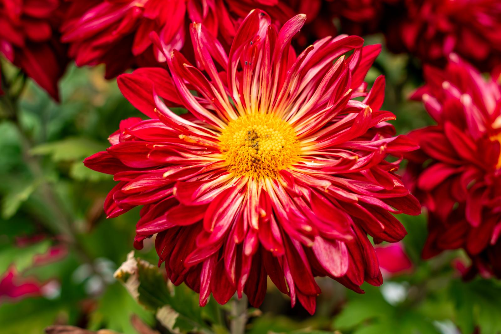 菊花,原产中国,菊科菊属多年生宿根草本植物。茎直立,被柔毛。叶互生,有短柄,叶卵形至披针形,长5至15厘米。头状花序,单个或数个集生于茎枝顶端。