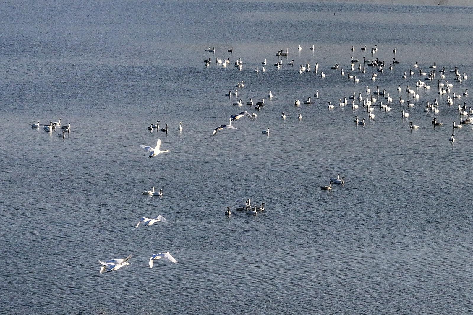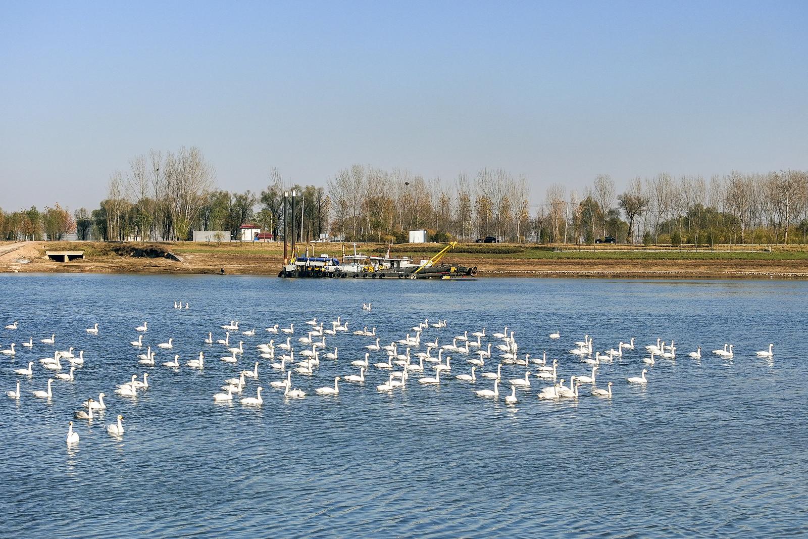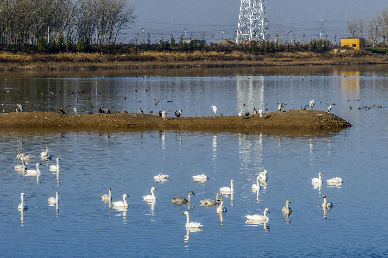 11月19日,白天鹅、灰鹤、白鹤等候鸟在平遥县境内汾河三坝库区嬉戏、觅食、休憩。