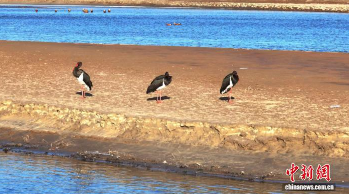 在山西省忻州市河曲县城黄河段,几只黑鹳悠然驻足、觅食休憩,优雅的身姿与奔腾的黄河、广袤的湿地绘就一幅和谐的自然画卷。