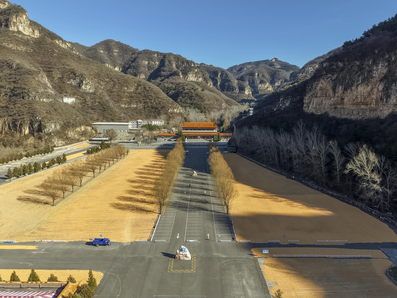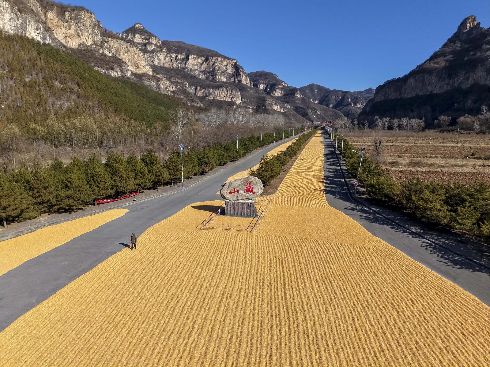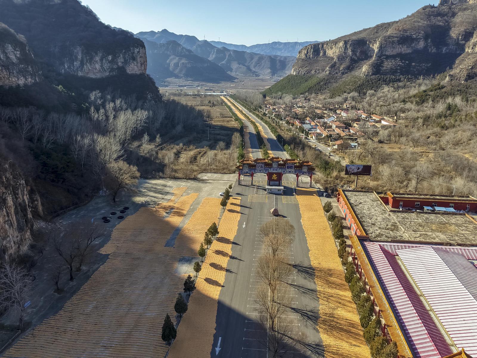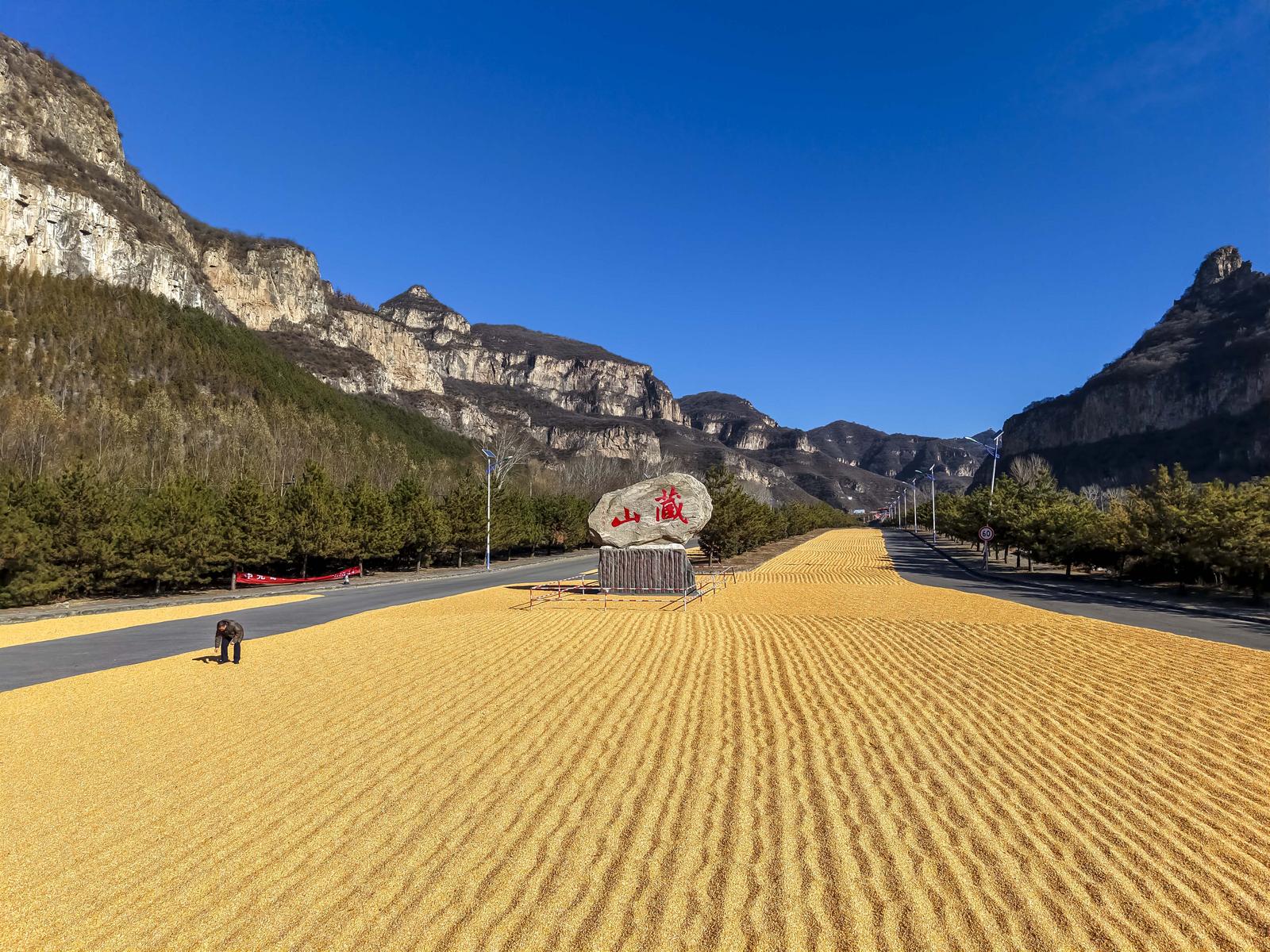 11月20日,山西省阳泉市盂县苌池镇藏山村村民抢抓晴好天气晾晒玉米。冬日暖阳下,金灿灿的玉米宛如“金光大道”,尽显丰收景象。