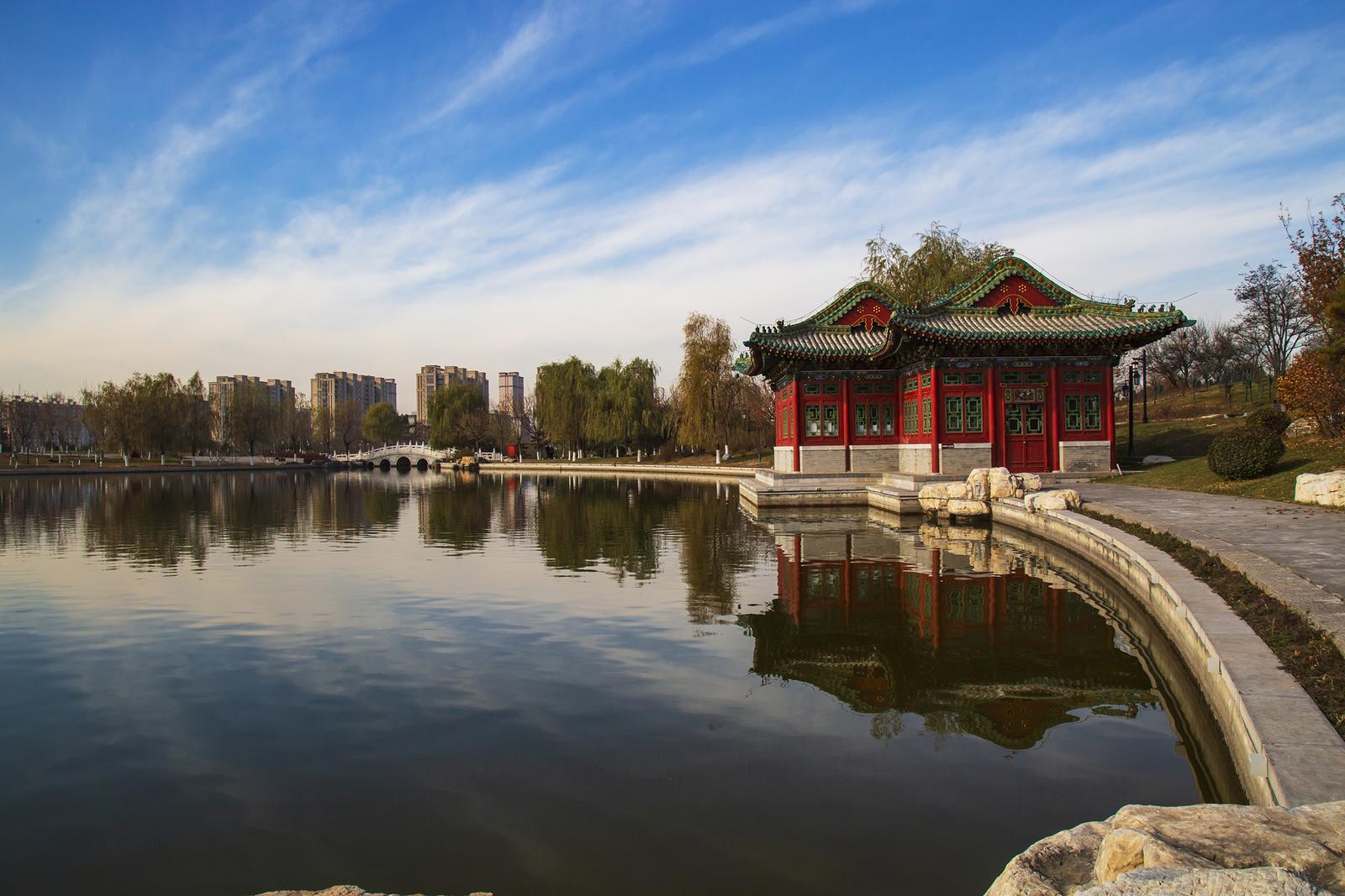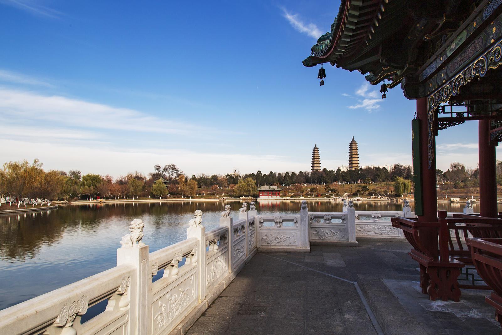 11月20日,山西太原双塔公园内湖水澄澈见底,红墙碧瓦在冬日暖阳的映照下熠熠生辉,蓝天下,凌霄双塔挺拔壮美,吸引不少市民游客前来观赏游玩,感受冬日里的别样韵味。