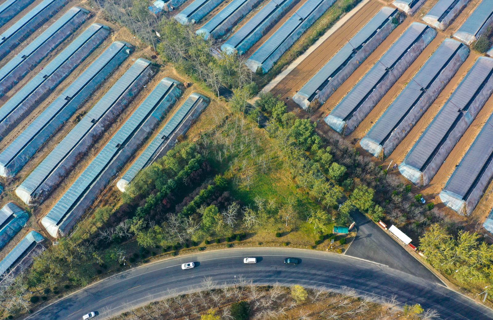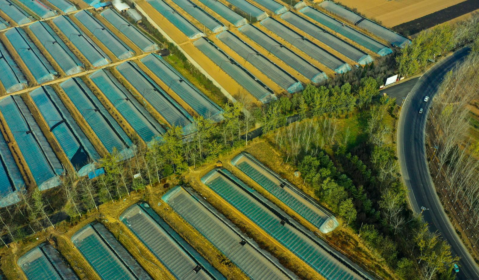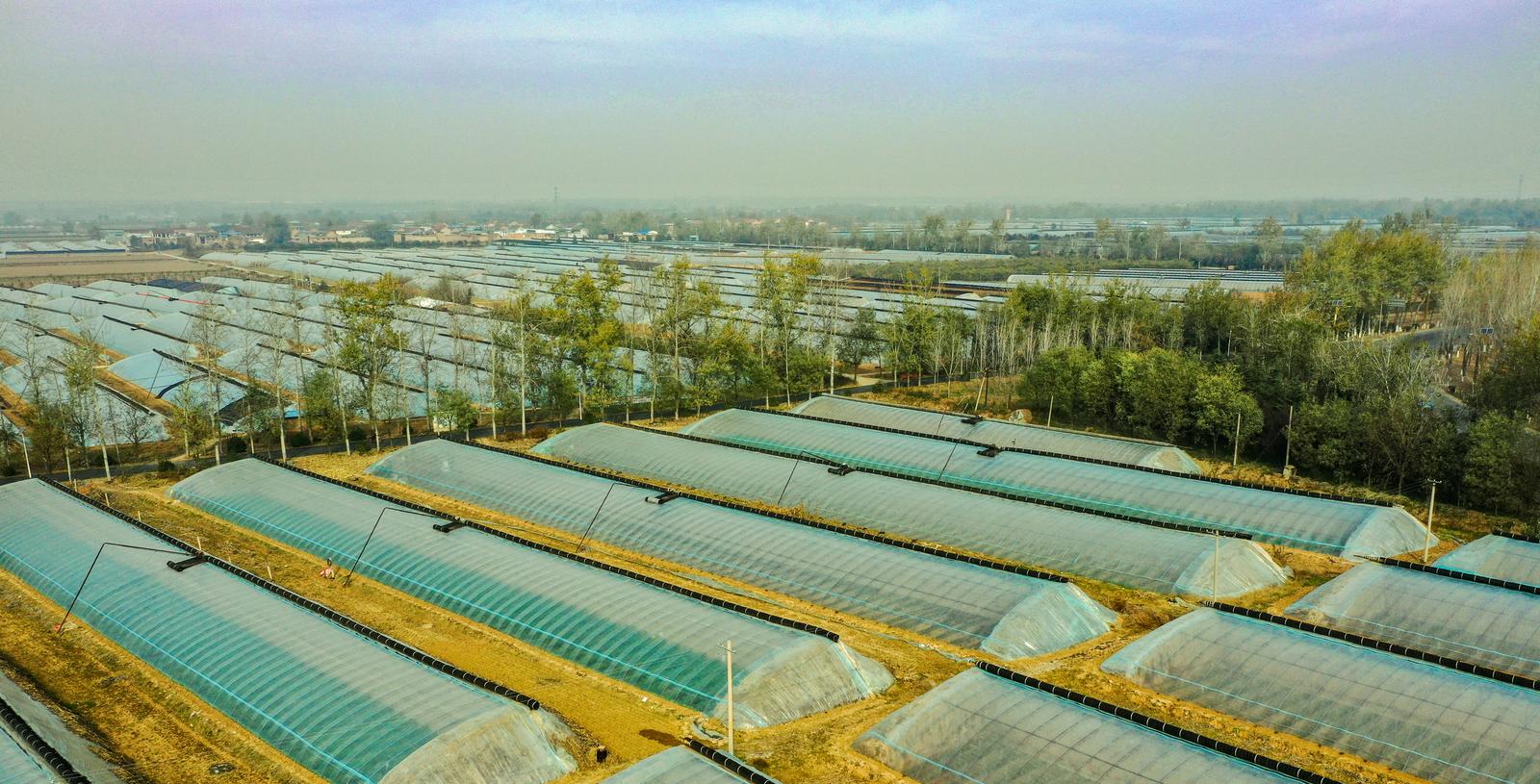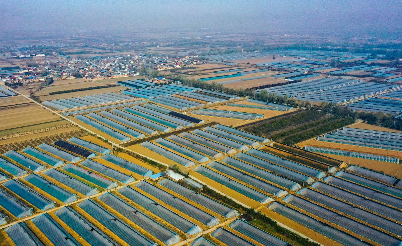 11月22日,山西省运城市夏县南大里乡,农田里设施农业大棚整齐排列,棚顶上的黑色保温被在冬日暖阳下格外醒目。