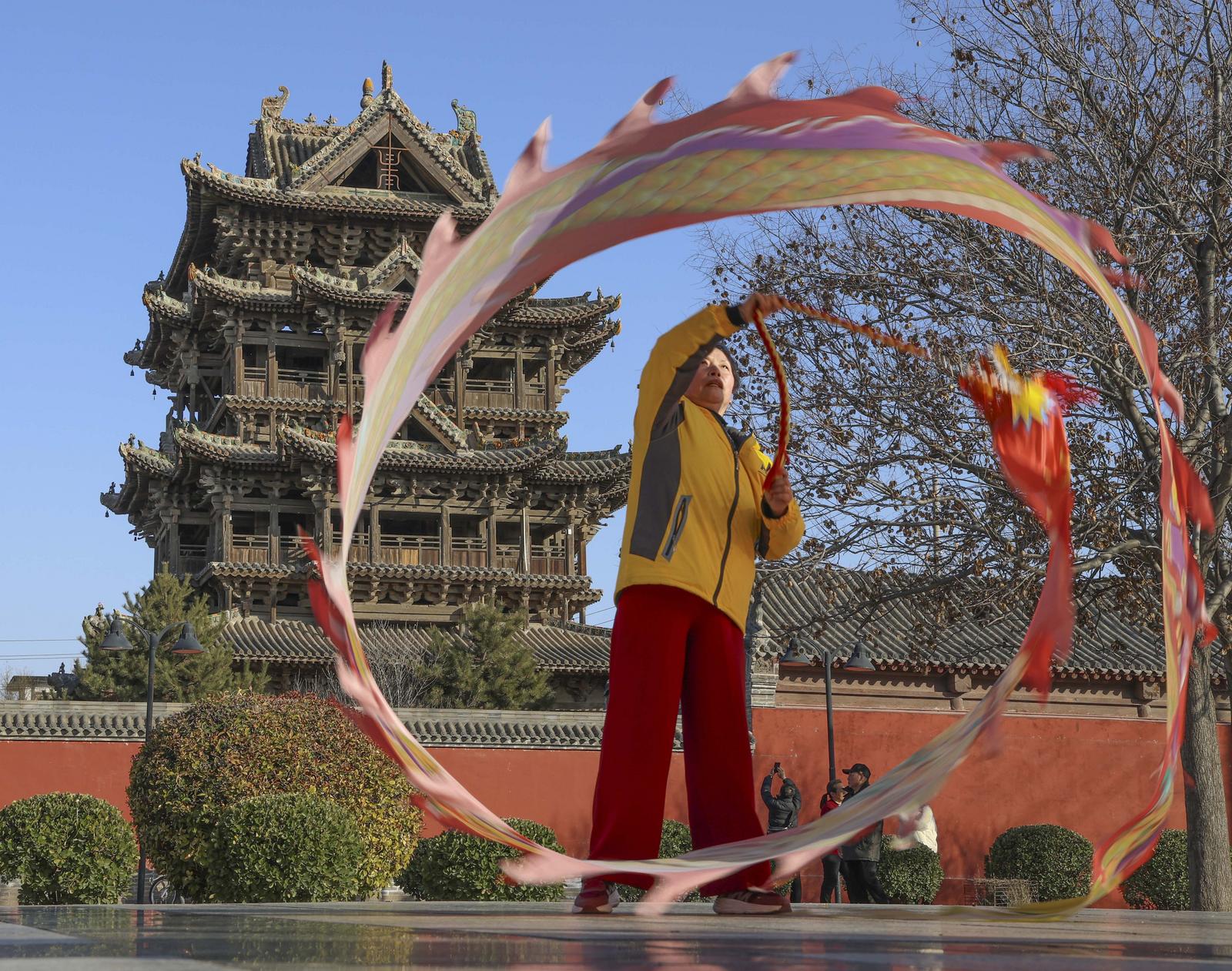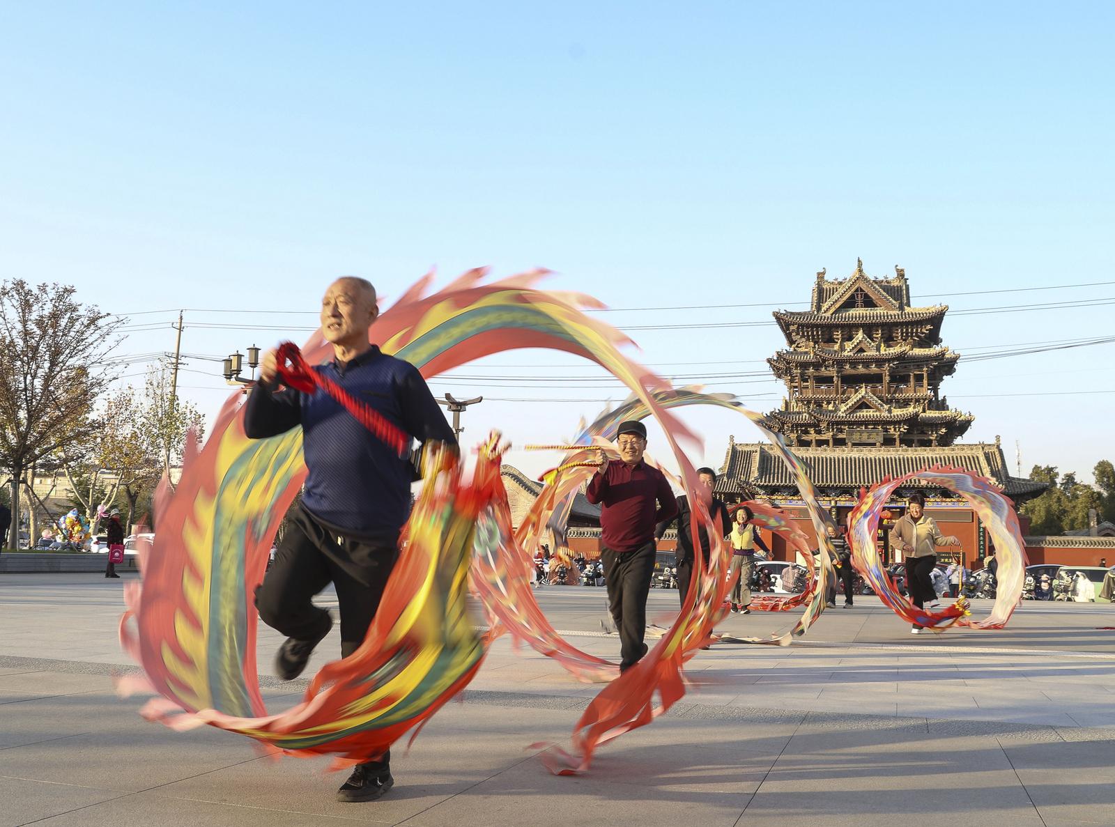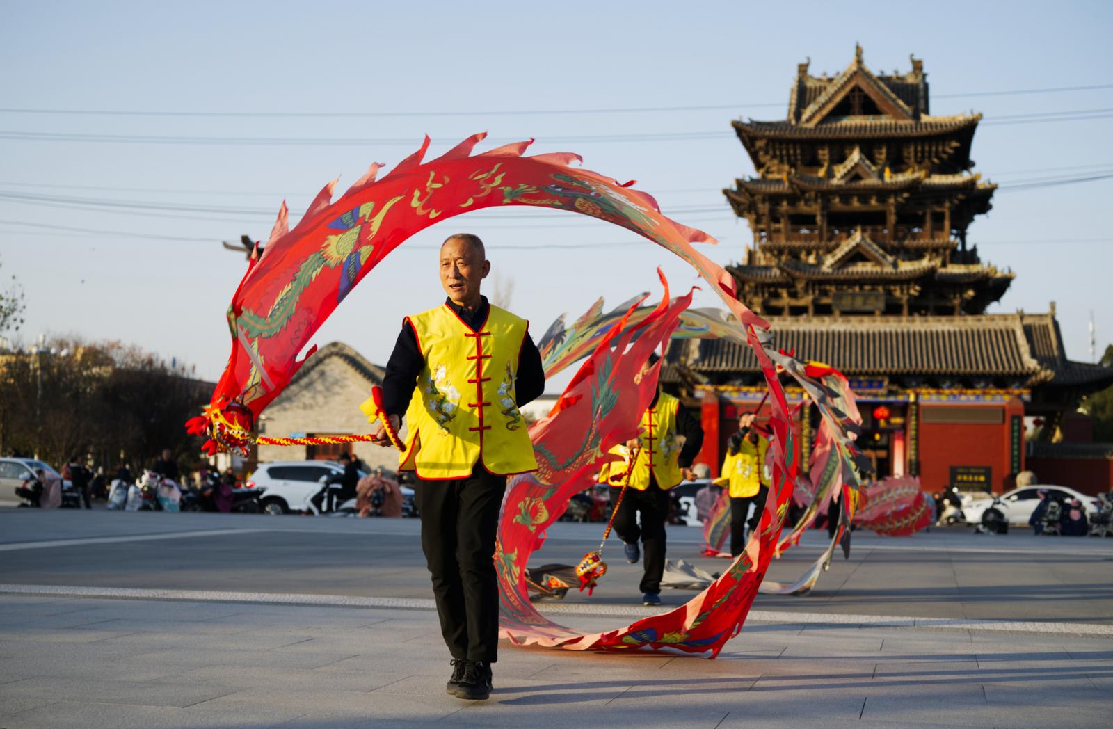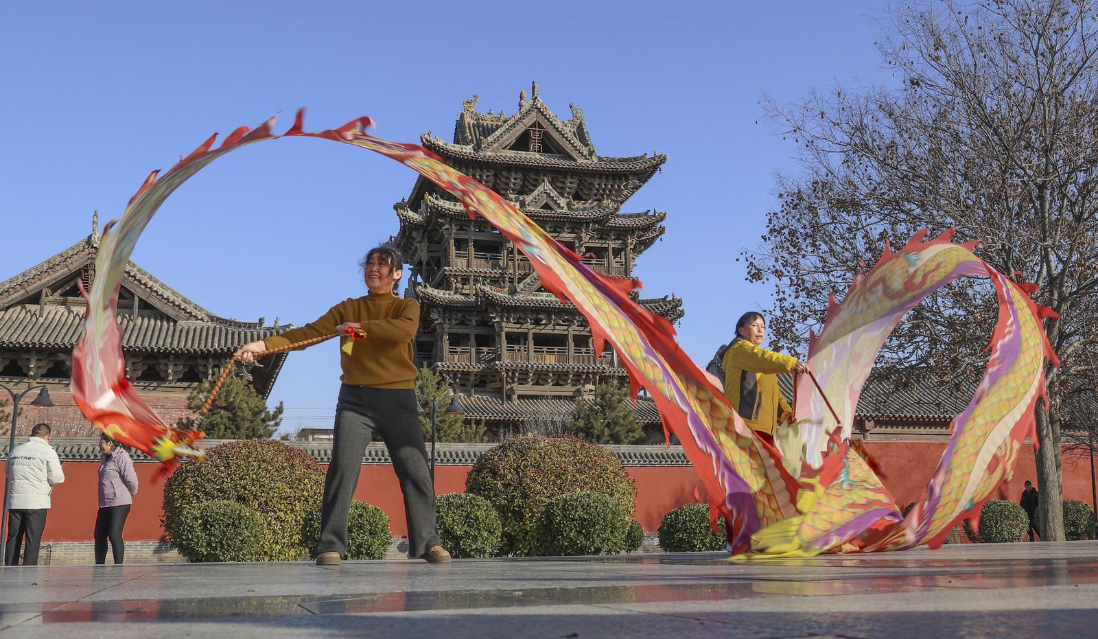 11月23日,山西省运城市万荣县健身舞龙队队员在飞云楼前舞彩龙。手中一条条“彩龙”在古朴楼阁前腾跃盘旋,红绸翻飞间尽显民俗风采。