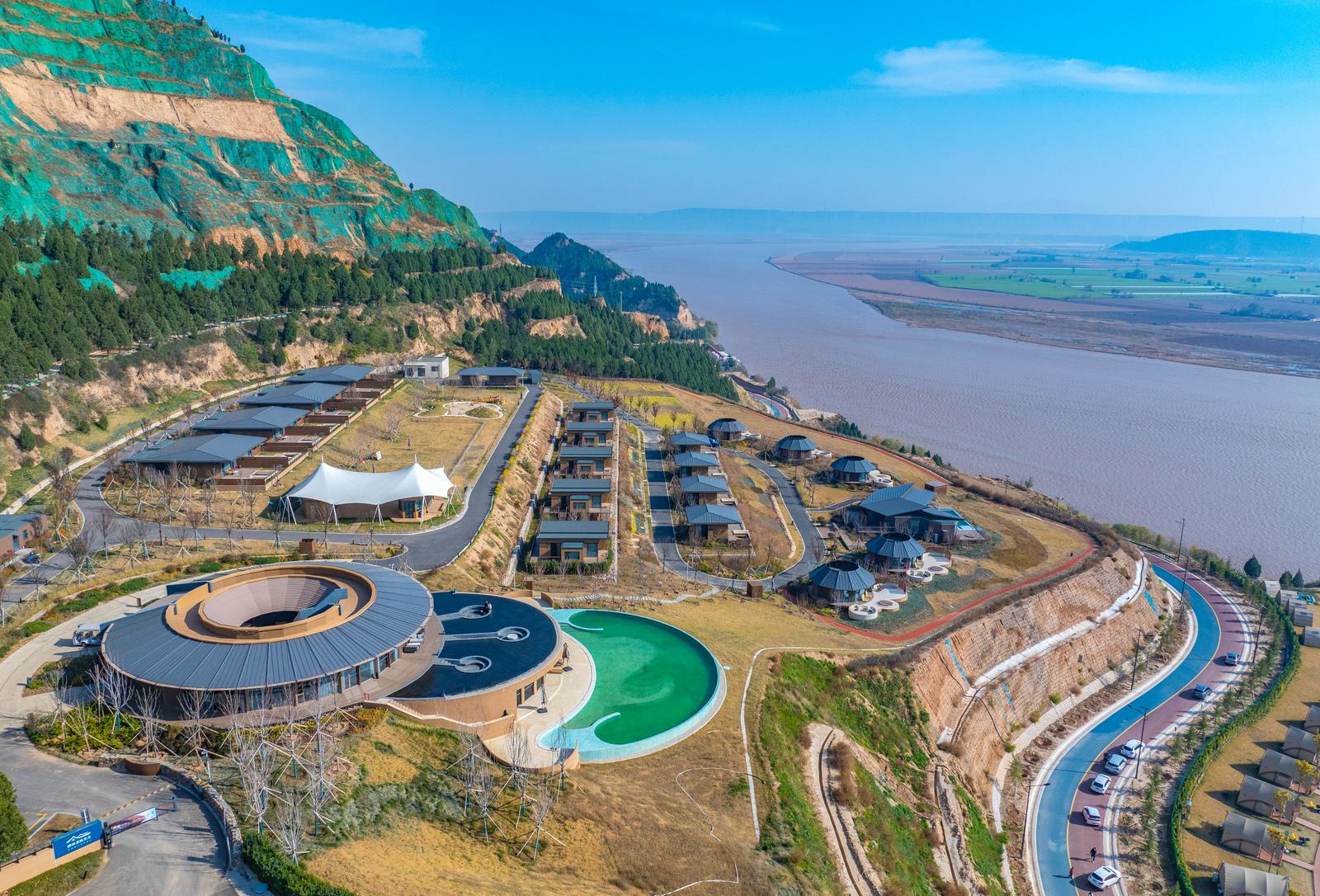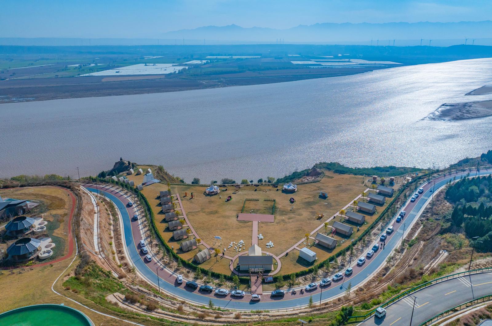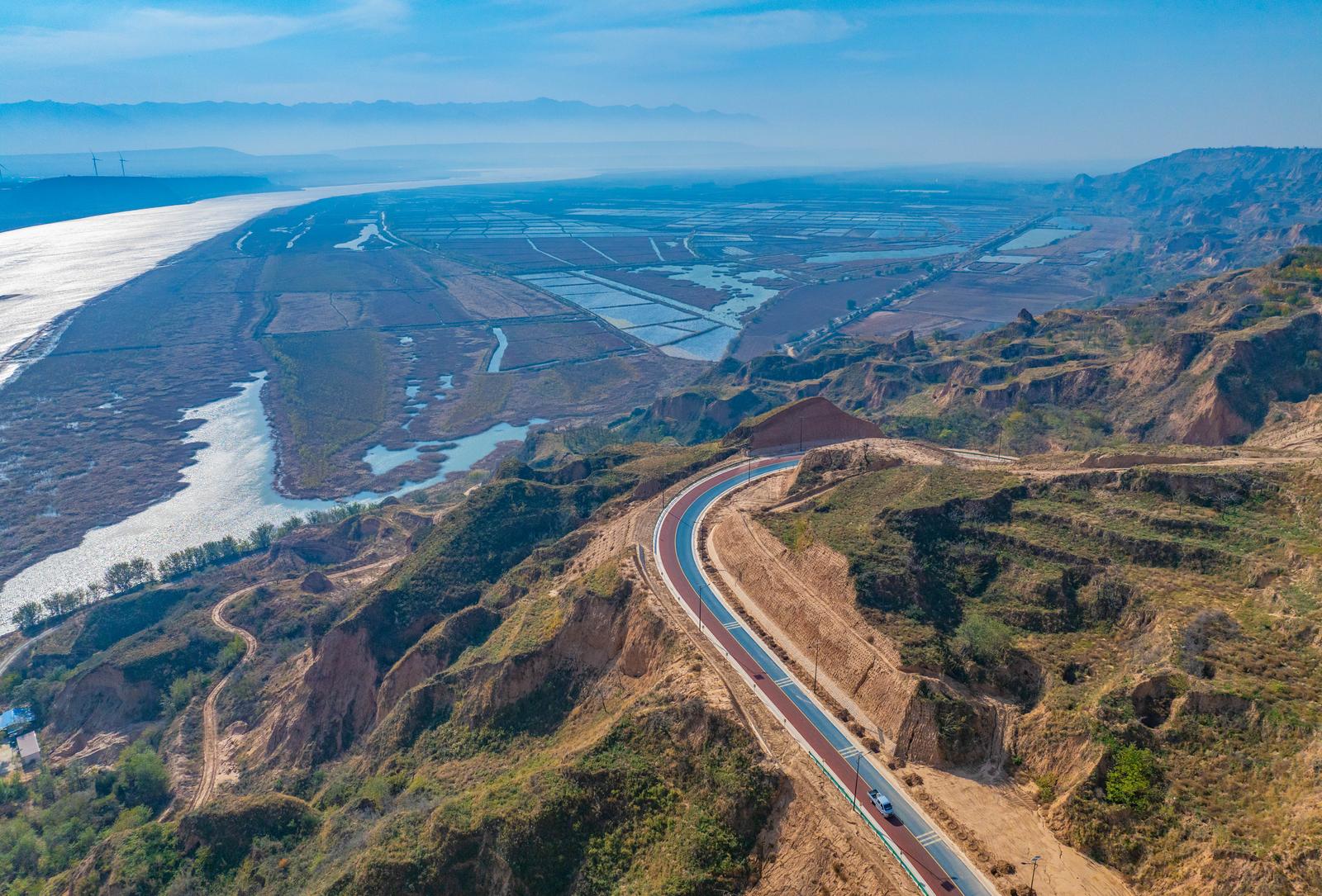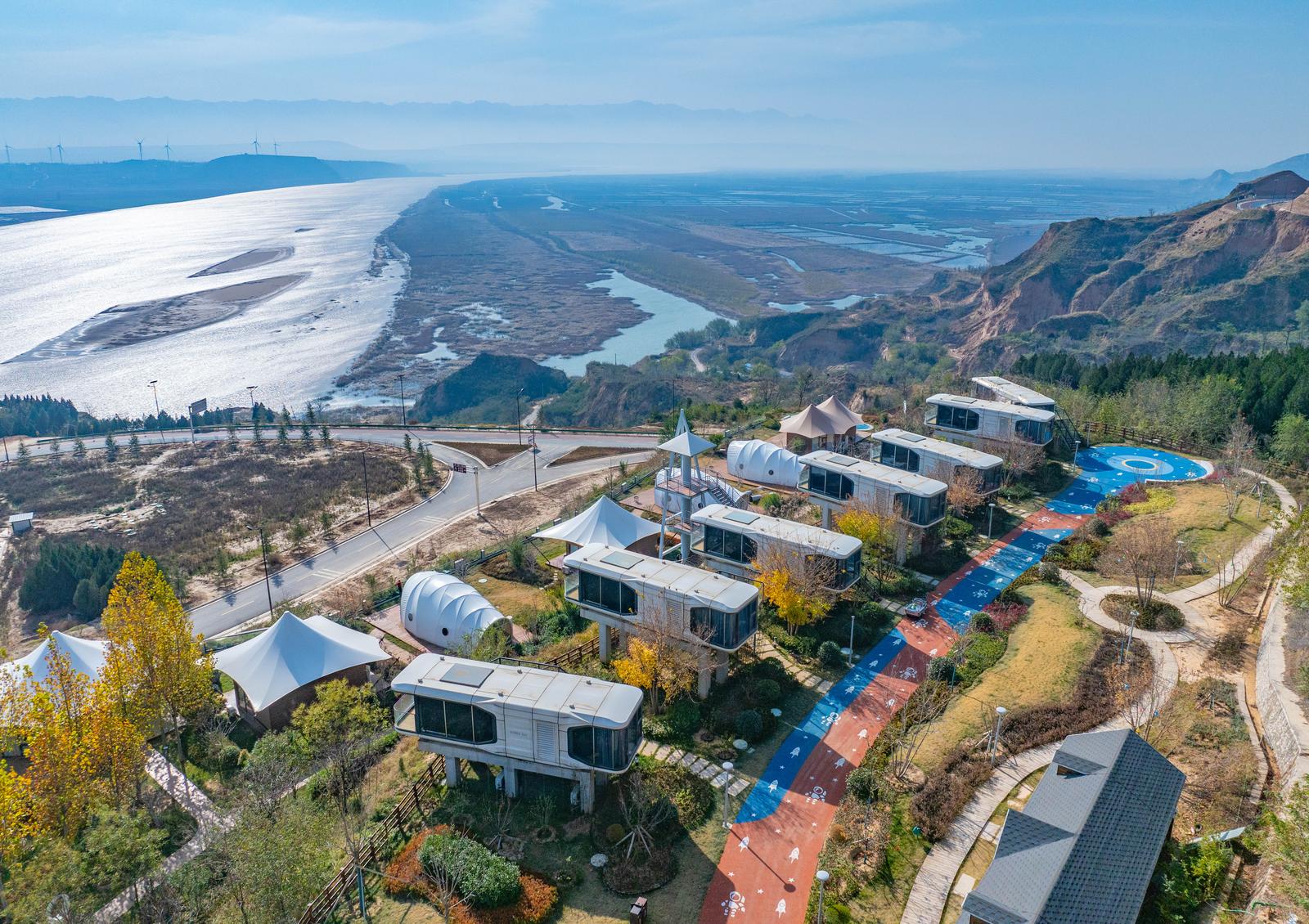 高空俯瞰,黄河蜿蜒如龙,与崭新的黄河一号旅游公路、极具未来感的太空舱相映成趣,美不胜收。