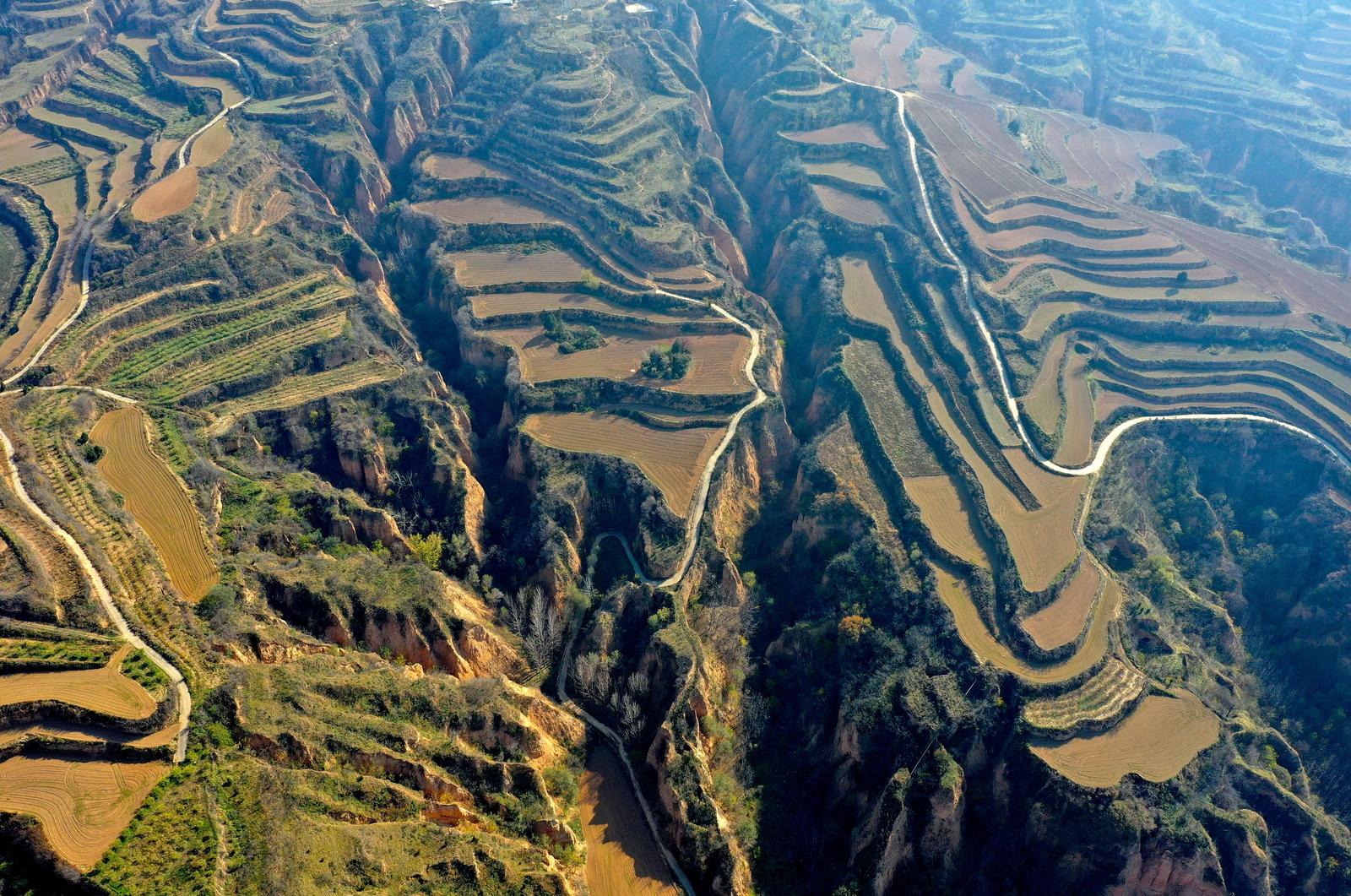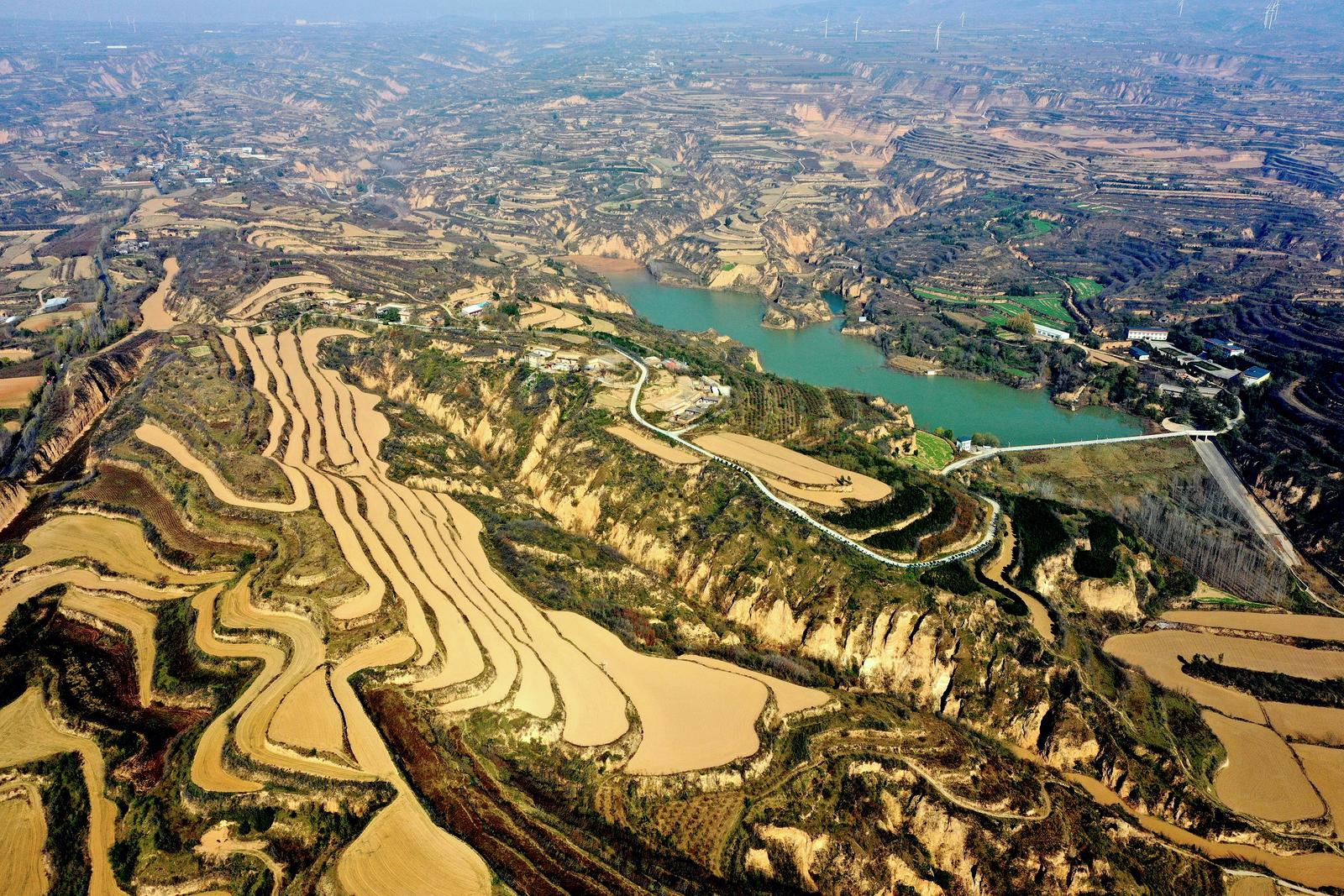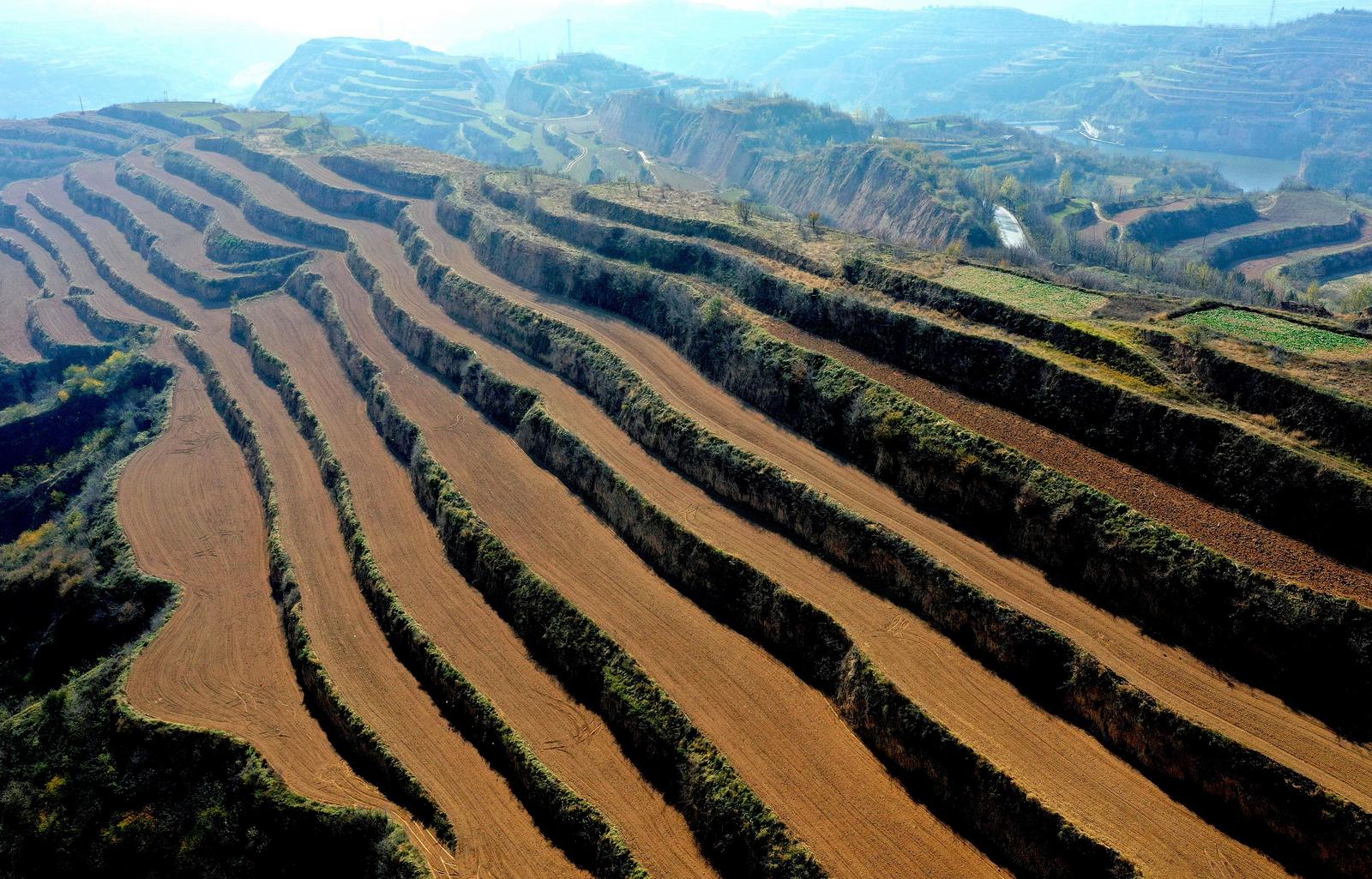 初冬时节,山西省运城市平陆县圣人涧镇境内的层叠梯田,在蓝天白云的映衬下宛如大地指纹。层层田垄依山势蜿蜒伸展,与错落分布的村庄、澄澈的水库相映成趣,美不胜收。