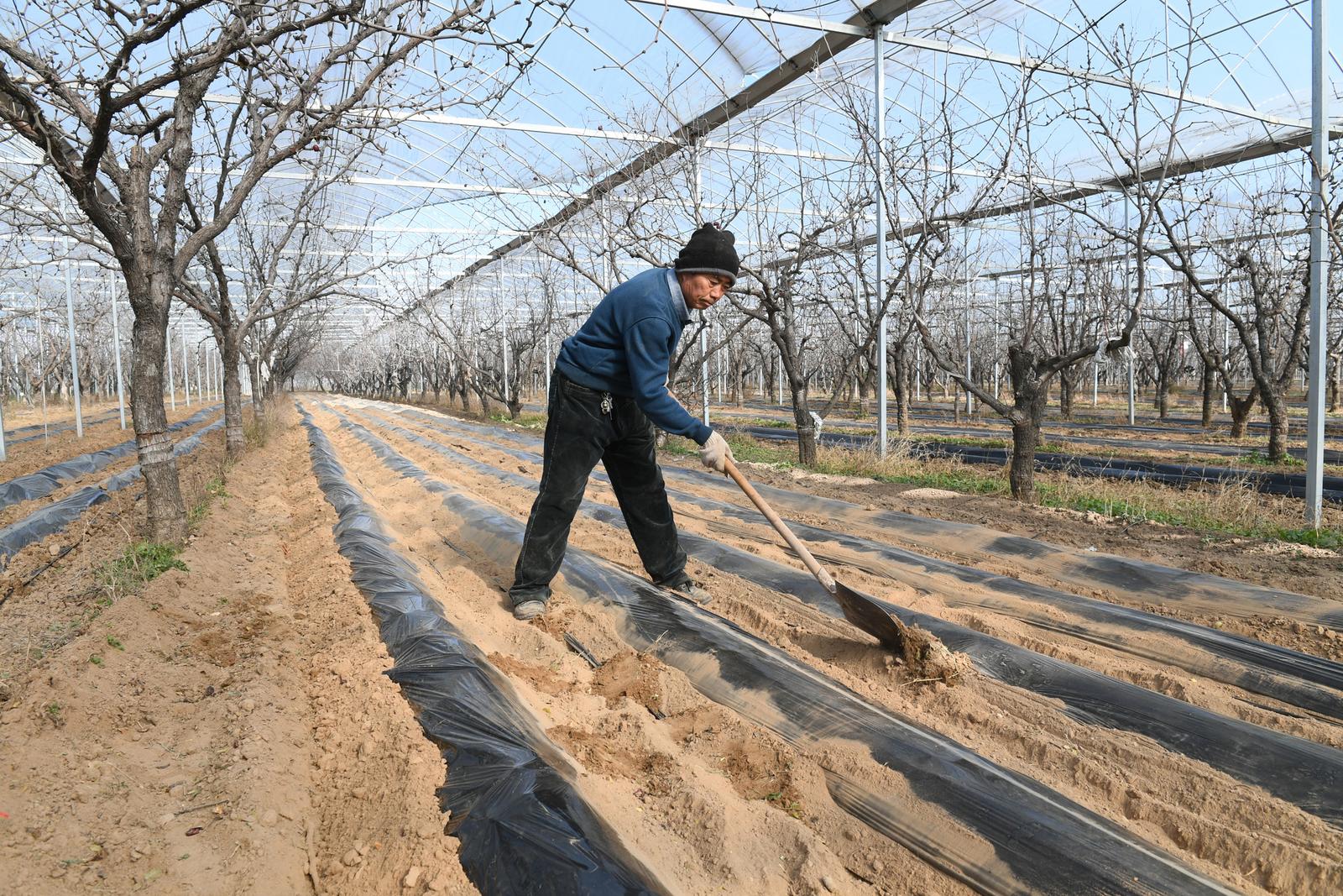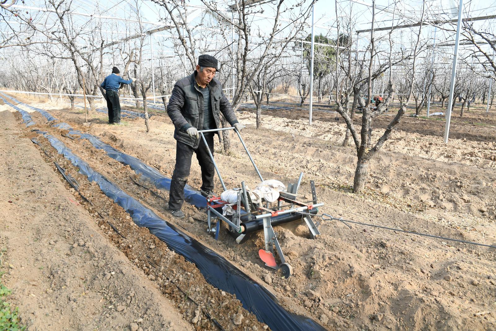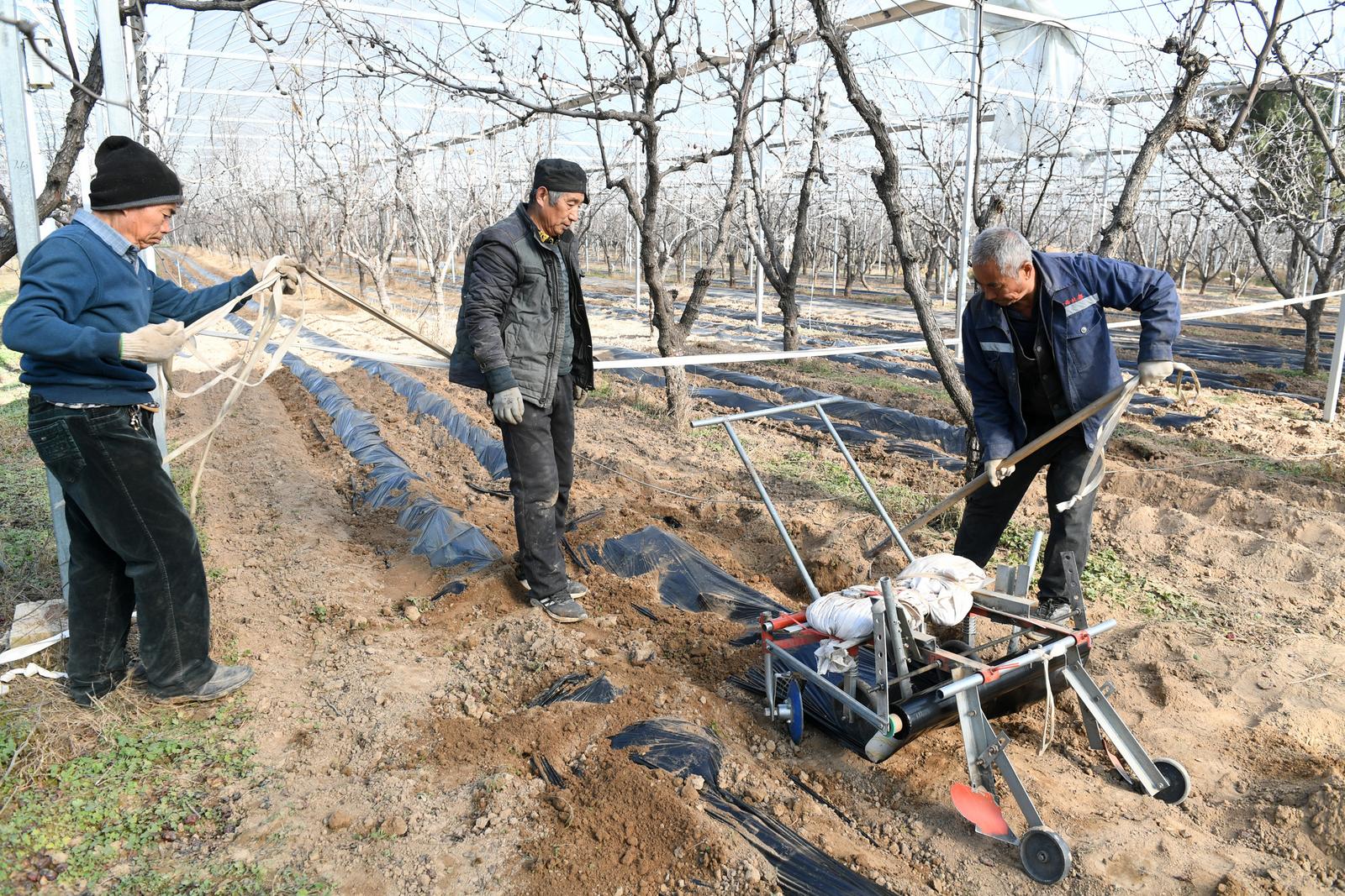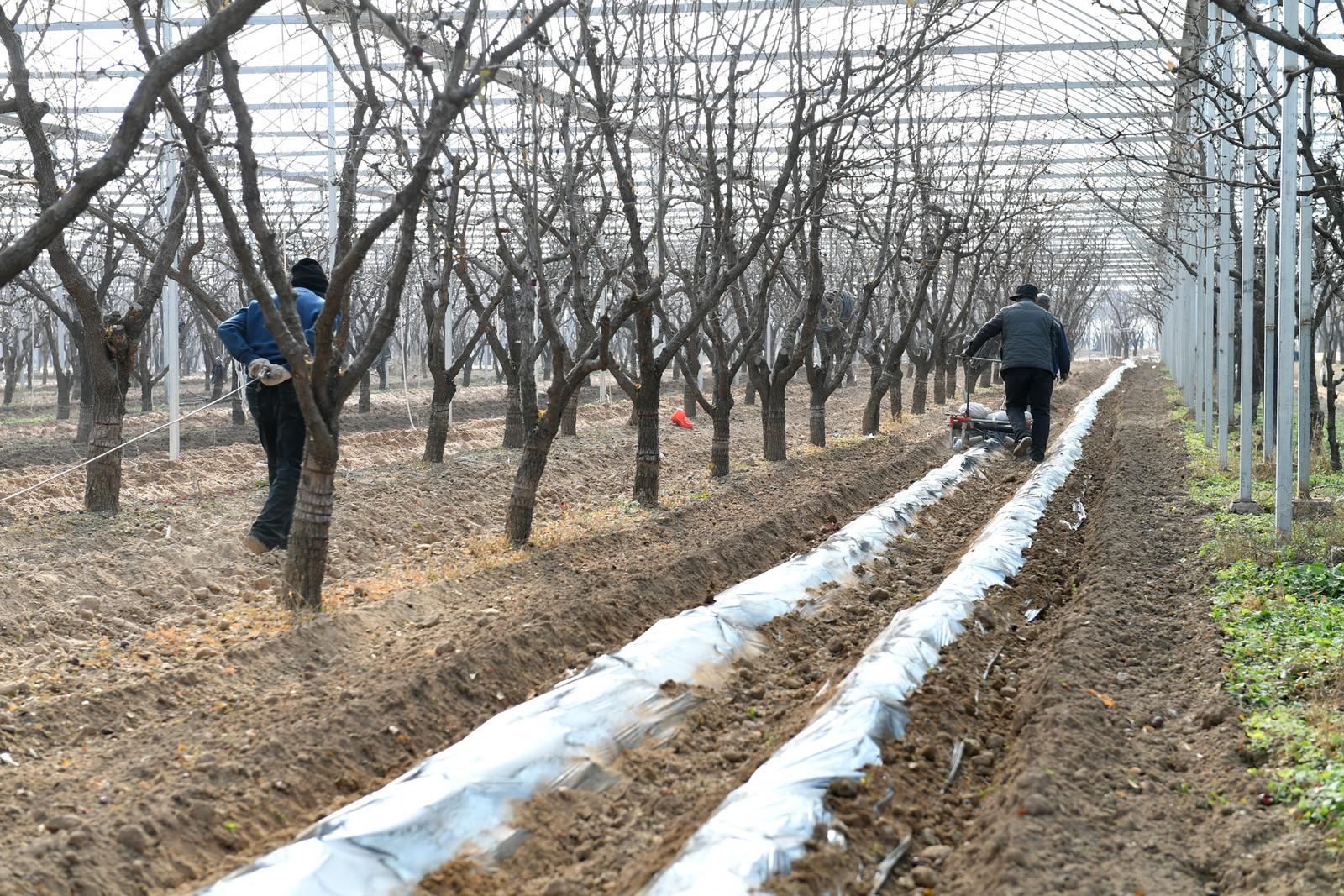 11月25日,山西省运城市稷山县稷峰镇加庄村村民在给板枣林下种植的中药材覆盖地膜。
