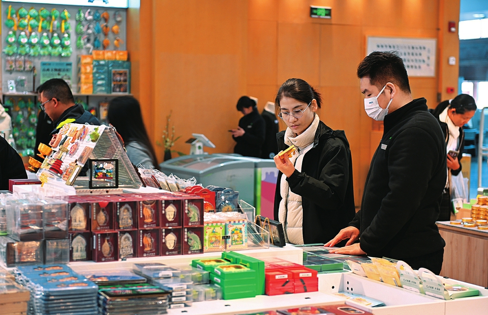 11月25日,众多游客在山西博物院选购特色文创产品。山西博物院具有三晋文化底蕴与前卫设计的系列文创产品,为游客带来新潮的文化消费体验,吸引众多游客在参观之余进行挑选,感受魅力三晋的文创活力。