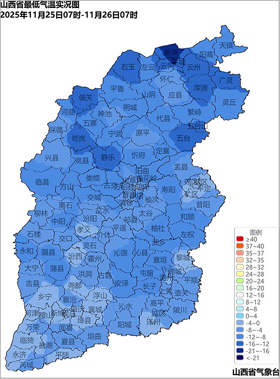 11月25日07时至26日07时,全省各地最低气温介于-16.7℃(新荣区)~-0.5℃(乡宁)之间。我省全域共117个县(市、区)最低气温在0℃以下,其中,左云、中阳、榆社、蒲县、方山、小店区、阳曲、娄烦、寿阳、平鲁区、五寨、岚县、襄垣、沁源、朔城区、左权、浑源、静乐、偏关、五台、云冈区、广灵、云州区、岢岚、右玉、平城区、新荣区共27个县(市、区)在-10℃以下。