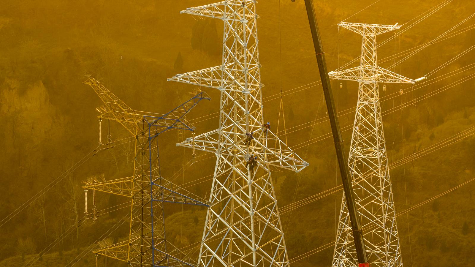 11月25日,在山西运城220千伏桃平一二线防覆冰改造工程施工现场,施工人员正在进行铁塔组立作业。