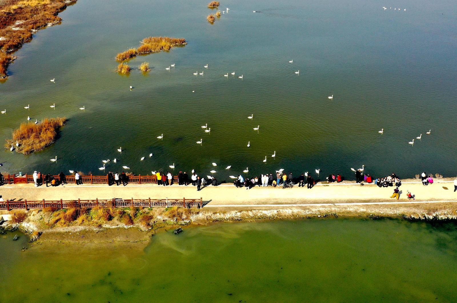 11月28日,在山西运城盐湖,三五成群的白天鹅或在水面嬉戏,或展翅翱翔,吸引了众多游客前来观赏。