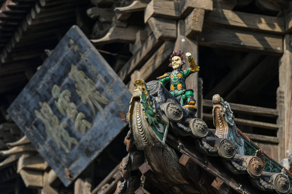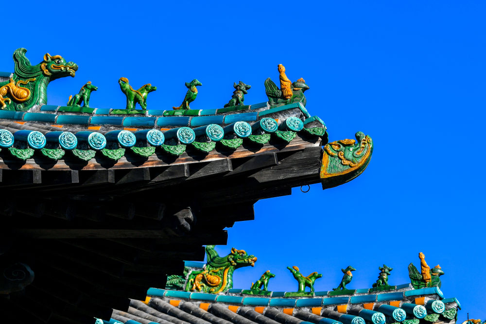 这是11月14日在山西省运城市解州关帝庙拍摄的古建顶上的装饰构件。