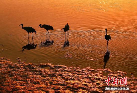 落日余晖洒下时,鹤群剪影与自然景致交融,宛如天然水墨长卷。