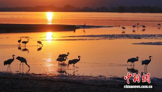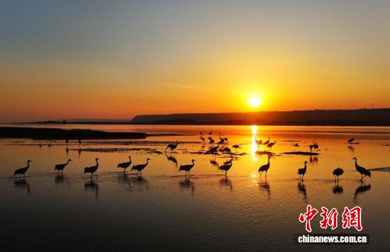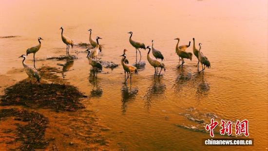 初冬时节,黄河万荣段,上千只灰鹤在滩涂湿地间翩跹起舞,构成一幅灵动的黄河冬日生态画卷。连日来,随着气温逐步走低,山西省万荣县黄河湿地迎来越冬候鸟迁徙高峰,成群结队的灰鹤或在滩涂悠闲觅食、或在河面嬉戏追逐,时而集群振翅升空,掠过黄河水面,舒展的翼尖划破天际,鸣叫声此起彼伏,为寂静的冬日湿地注入勃勃生机。落日余晖洒下时,鹤群剪影与自然景致交融,宛如天然水墨长卷。