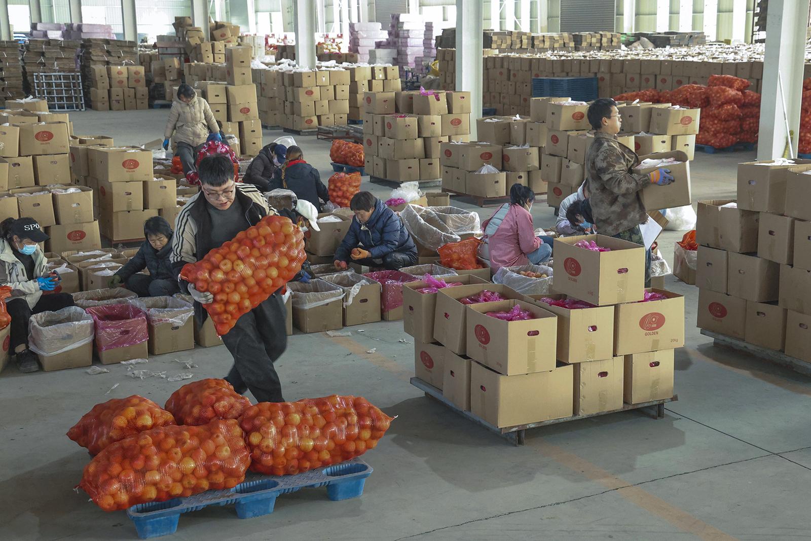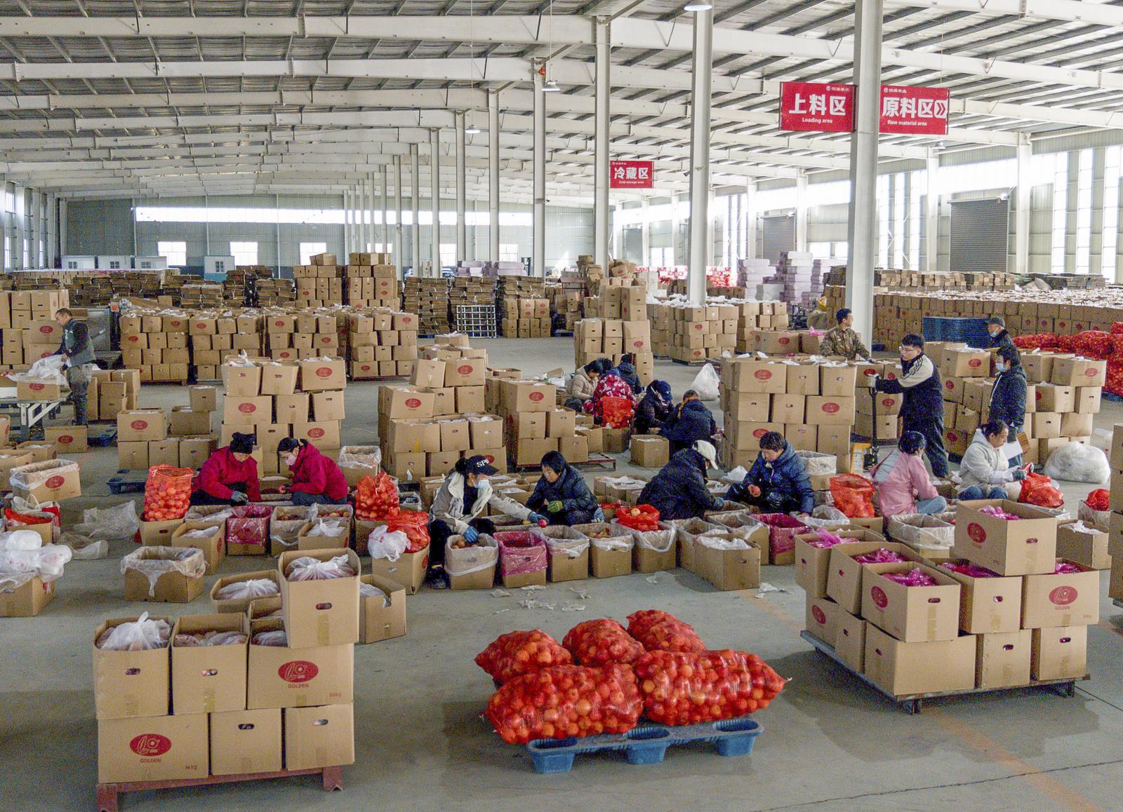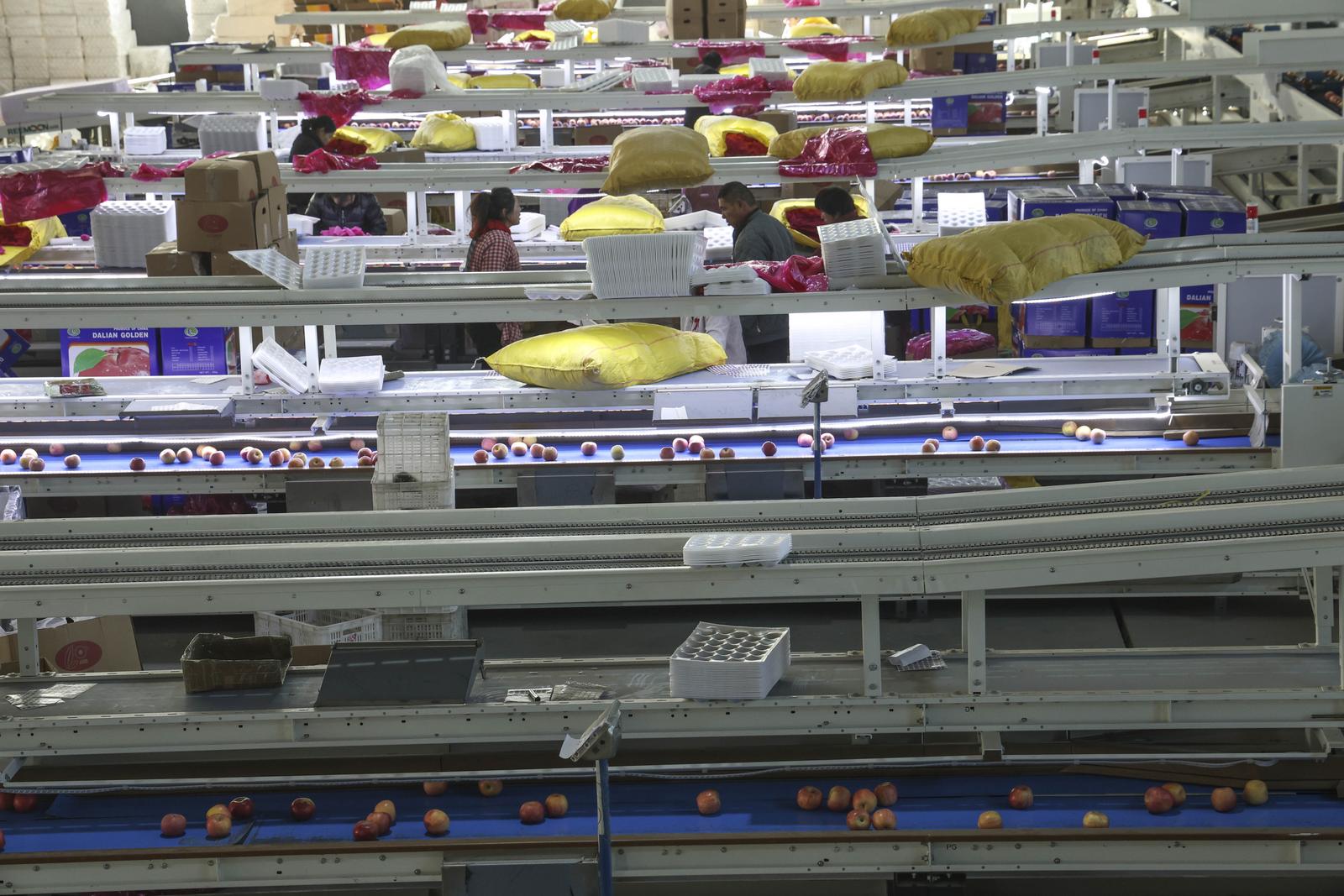 12月2日,山西省运城市万荣县高村镇的恒源果业有限公司外贸包装车间内,工人正在为全自动化智能选果机转运苹果。