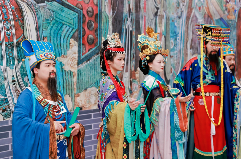 山西壁画展区同样引人入胜。泥板岩彩壁画临摹作品,精准还原古法艺术的细腻质感,展示了不同朝代在壁画艺术上的风格和笔法。整墙永乐宫《朝元图》及开化寺壁画落地条幅,成为路人驻足打卡的热点。