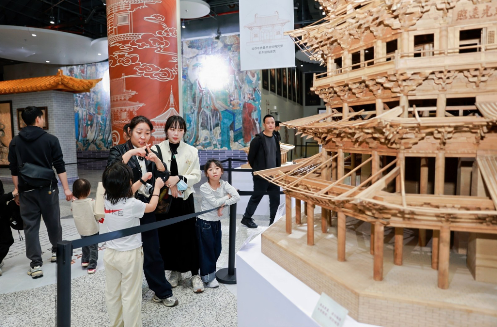 在山西古建展区,应县木塔模型尤为醒目,与佛光寺、南禅寺等木构建筑模型共同诉说三晋大地的建筑智慧。藻井集锦通过向上看的显示屏呈现,淋漓尽致地展现了山西“地上博物馆”的深厚底蕴。