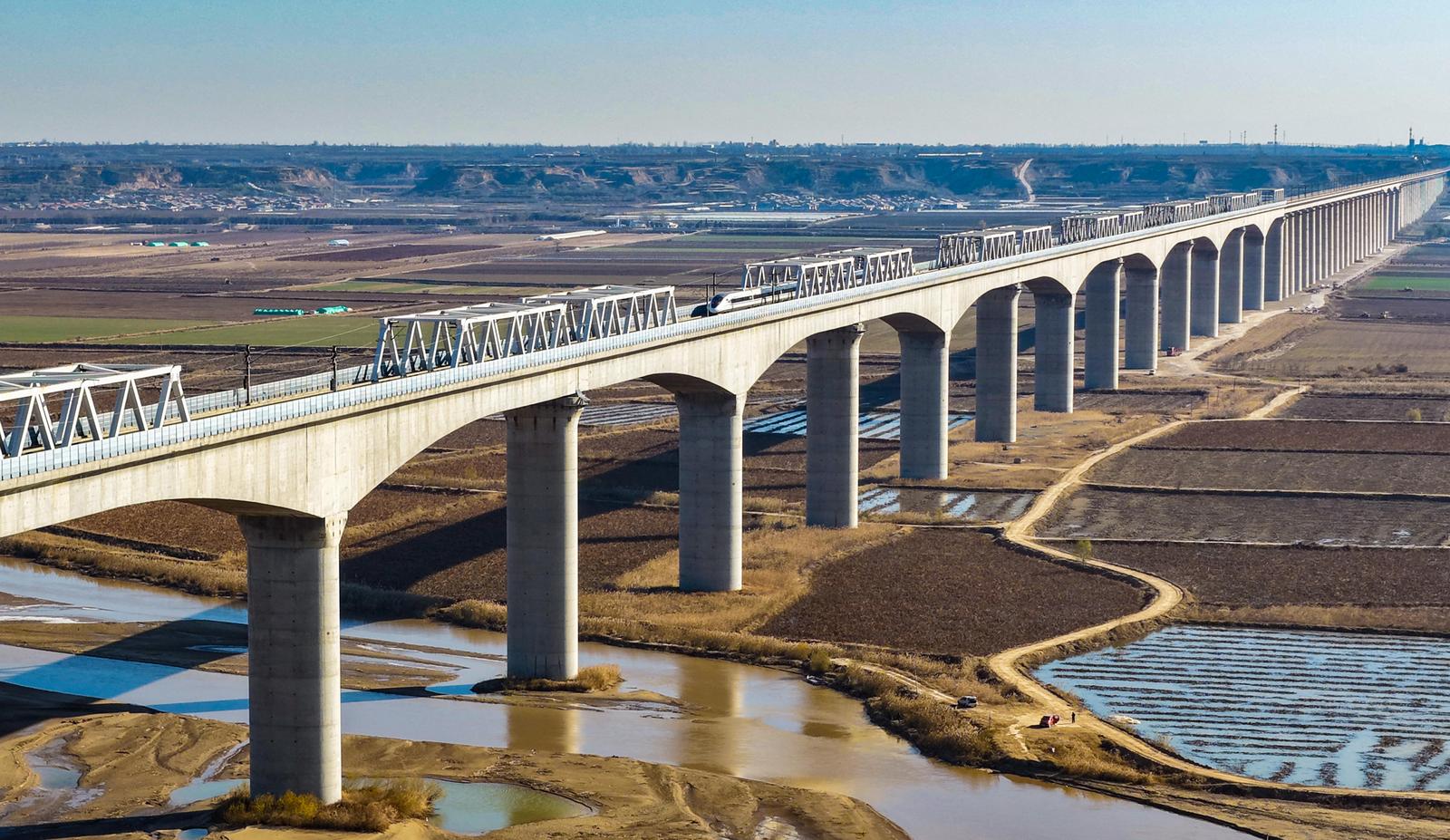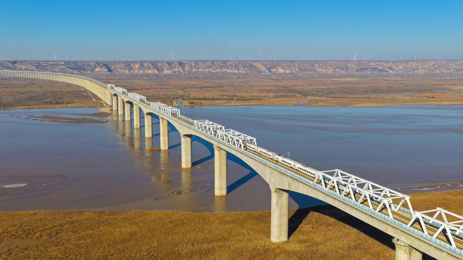 12月3日,大西高铁永济段黄河大桥上,一列动车组疾驰而过。桥下黄河奔涌向前,湿地植被交错分布,动静相映,绘就一幅和谐交融的生动画卷。