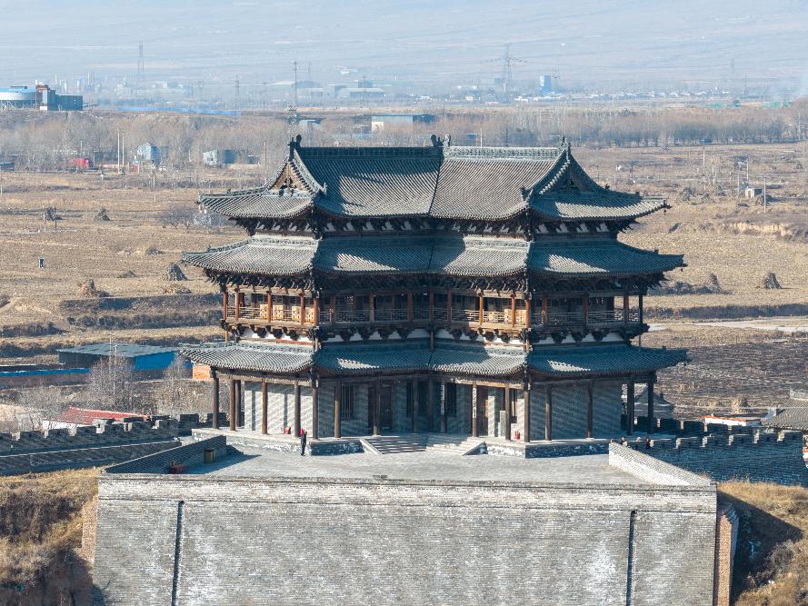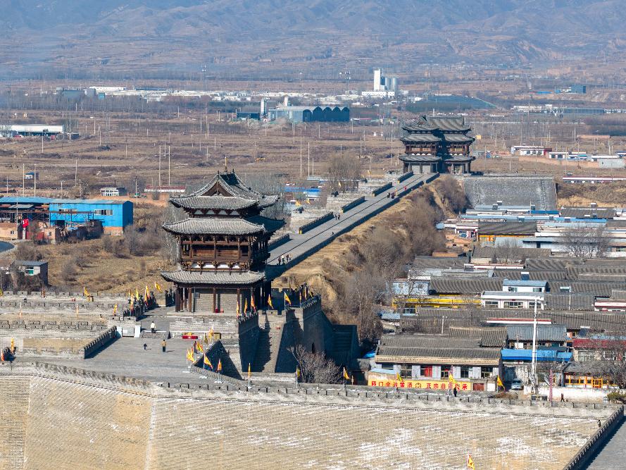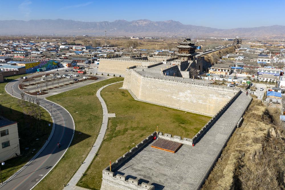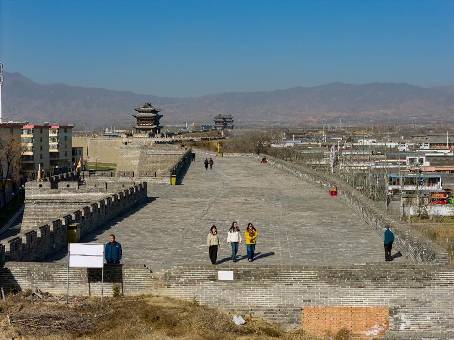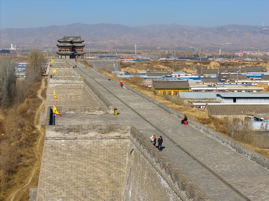 12月3日,山西省忻州市代县,游人登上代州古城西城墙,领略其雄伟风貌,饱览古城内外景致。