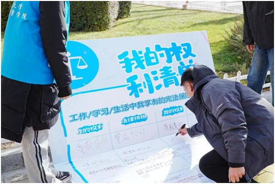 活动现场,“我的权利清单”展板前,同学们认真写下对宪法保障权益的期待,每一行字迹都透着对法治的向往;“法眼看生活”案例分享中,大家围绕校园日常、社会生活的真实场景拆解宪法依据,让条文“活”成了可感知的生活指引;“法条速记挑战”的趣味比拼里,抢答声此起彼伏,宪法知识点在轻松氛围中入脑入心。