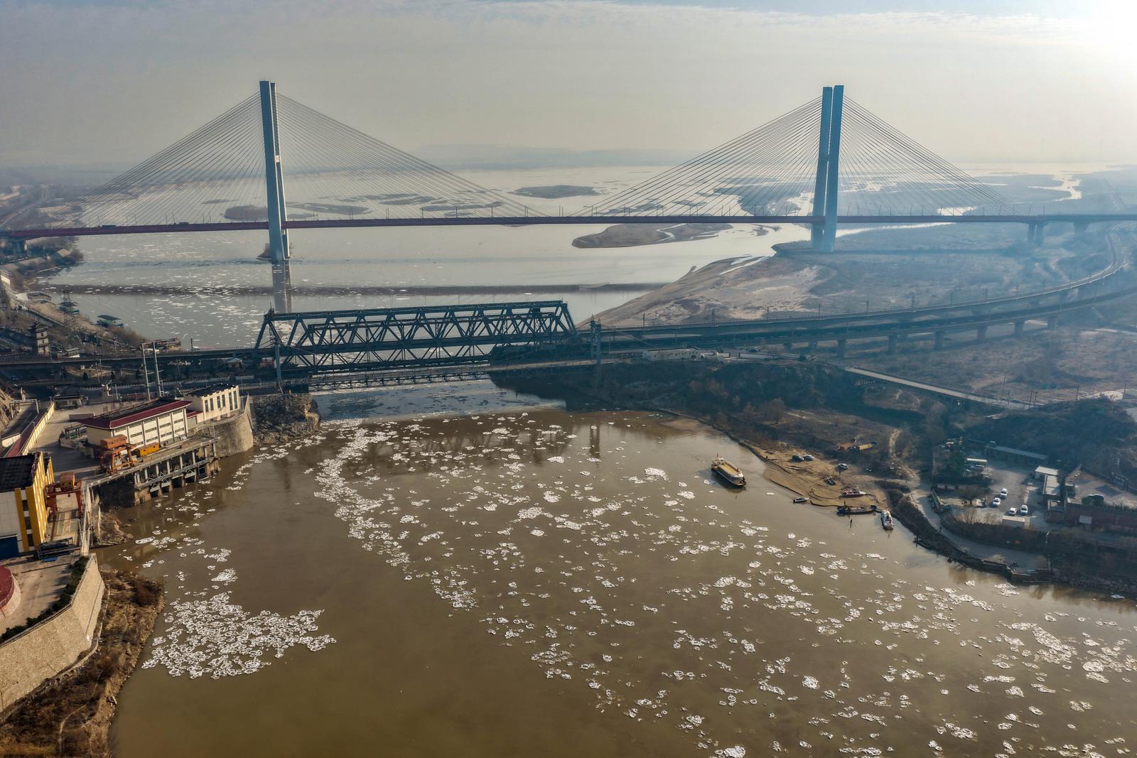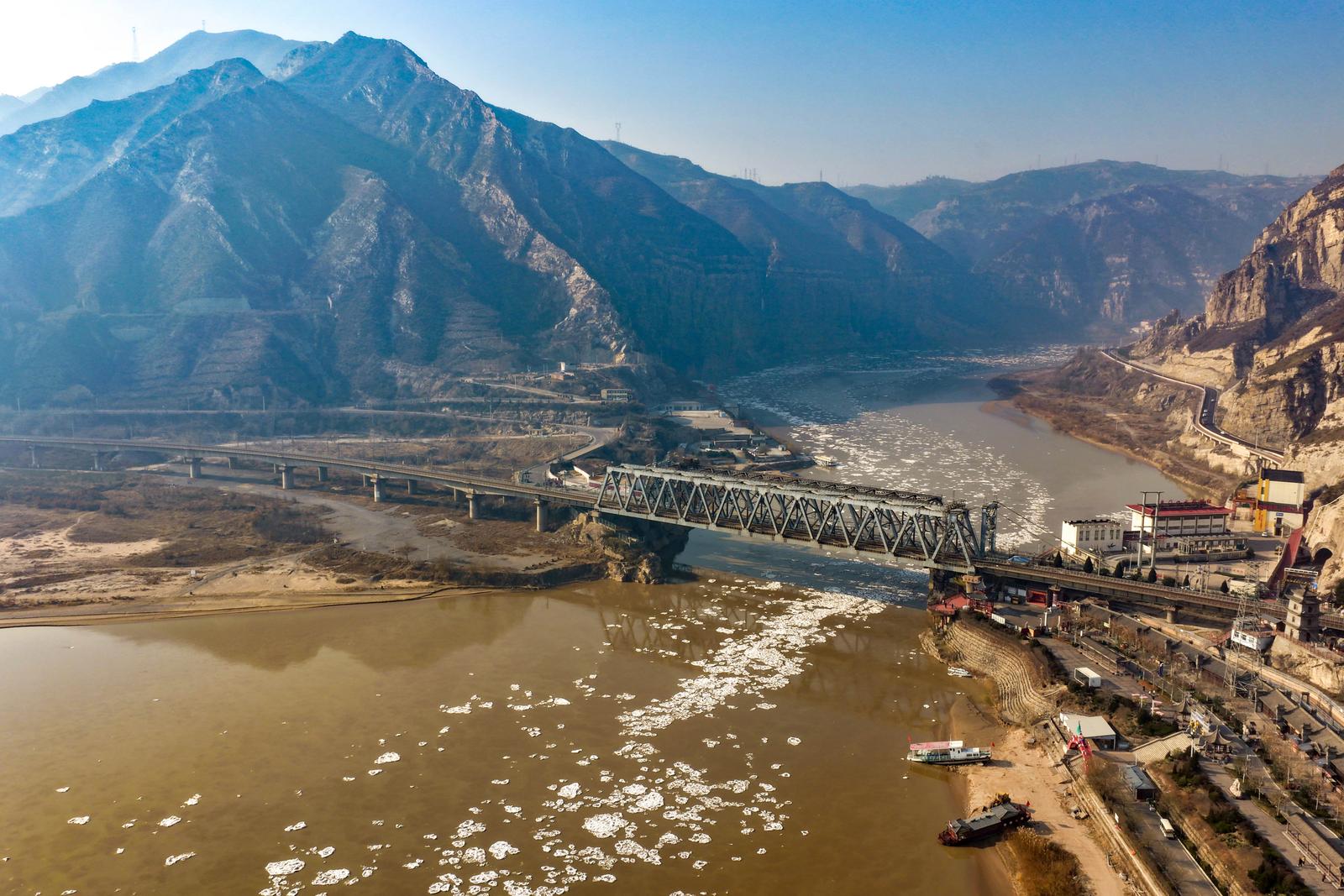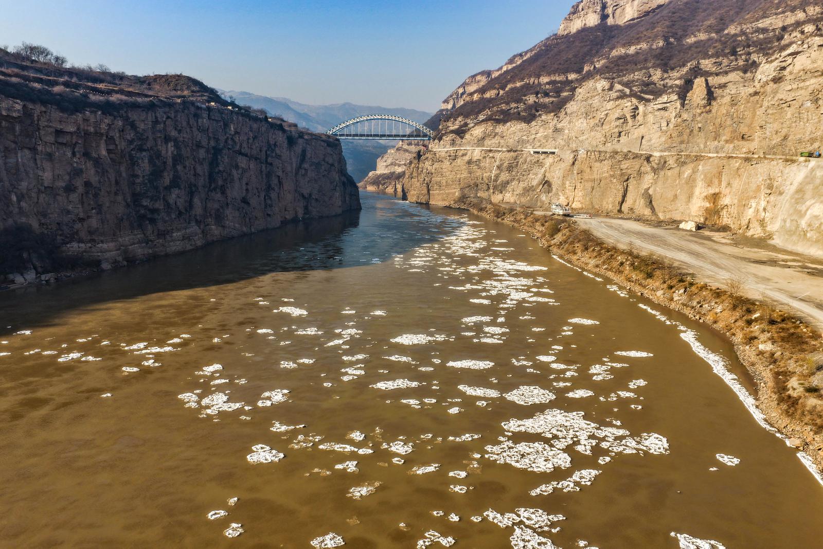 受近期持续低温天气影响,黄河山西河津段出现今年入冬以来首次流凌。在河道狭窄处,冰凌开始堆积;而在开阔河段,大量冰凌顺流而下。