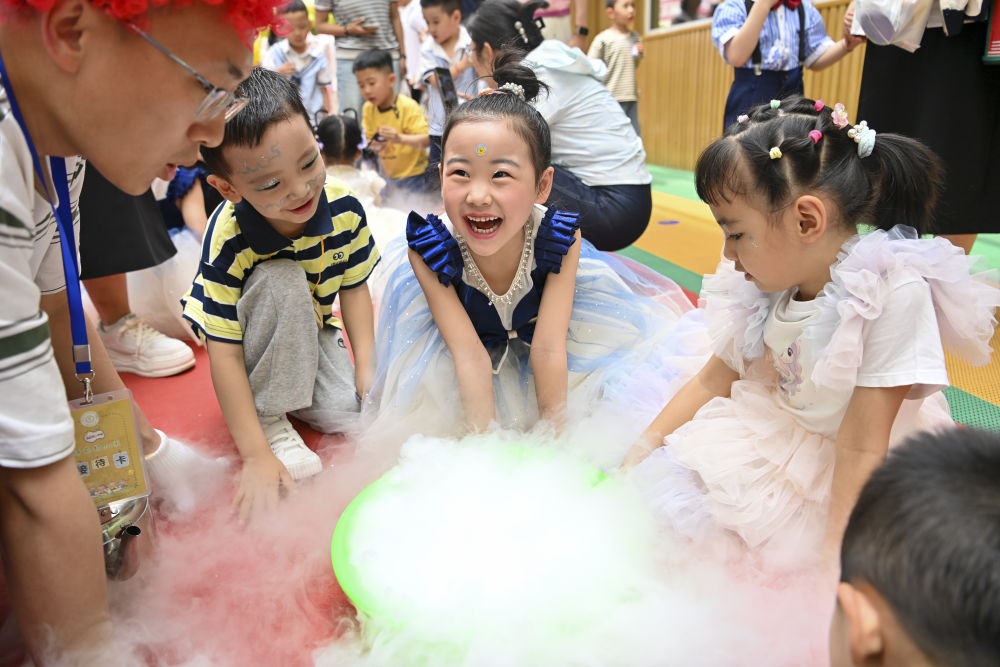 5月30日,山西省太原市迎泽区师苑幼儿园的小朋友在庆祝“六一”主题活动中观看干冰实验。新华社记者 杨晨光 摄