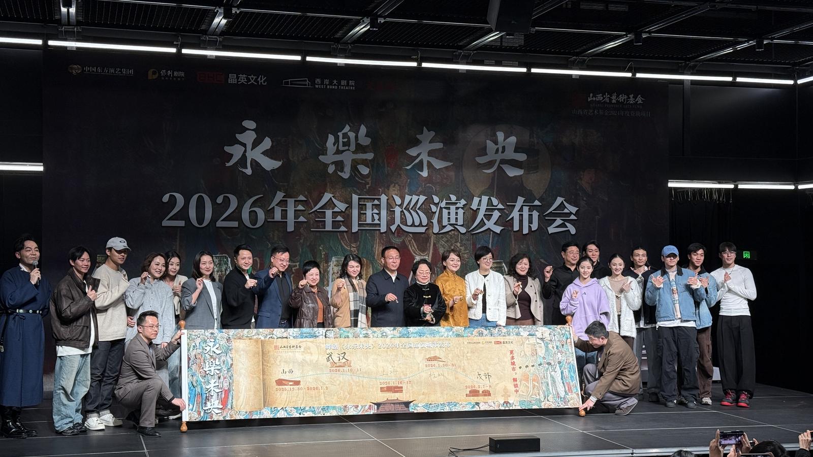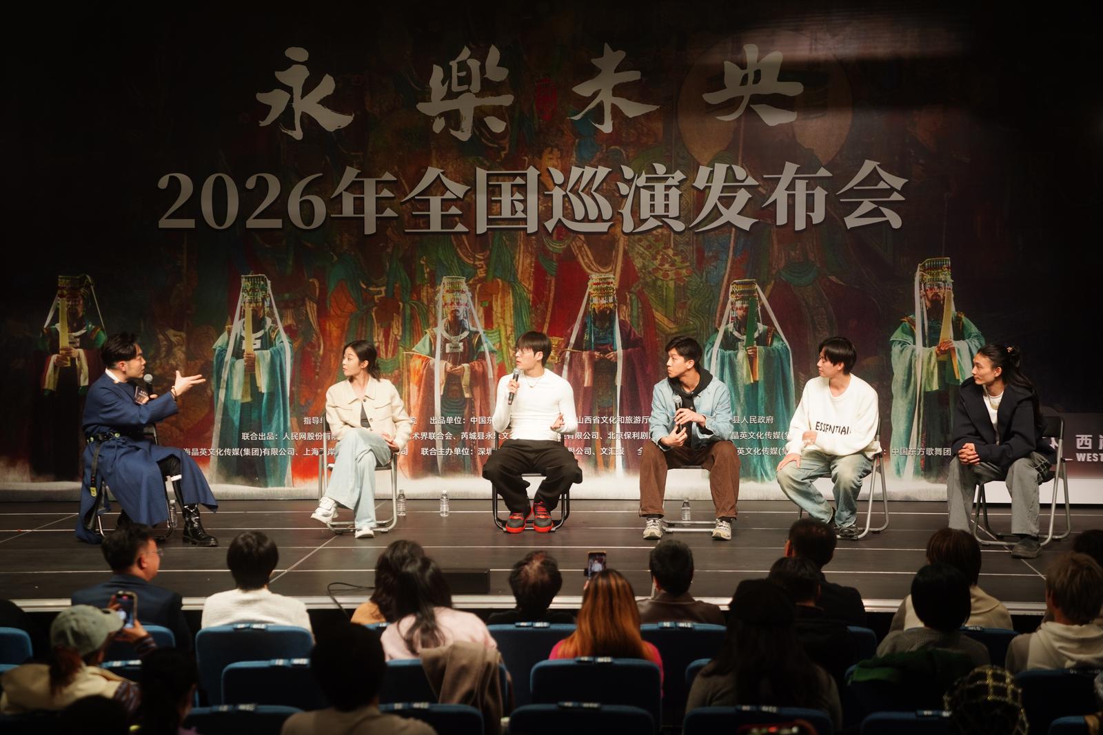 从立意到登台,《永乐未央》由以“80后”“90后”为主的主创团队历经两年半打磨,其中:张翰演绎“七百岁守护者”孔雀蓝釉角神,兼具文物沧桑与生命鲜活;南丁、丁太聪、王晶、吴富莉等凭扎实功底,再现壁画流转、榫卯相契、琉璃重铸的震撼场景。他们多次深入永乐宫采风,用当代审美解构历史,让静置的文物与技艺在舞蹈中“活”了过来,彰显出中华文脉的生生不息。启动仪式上,随着嘉宾共同展开巡演卷轴,2026年巡演计划正式拉开序幕。