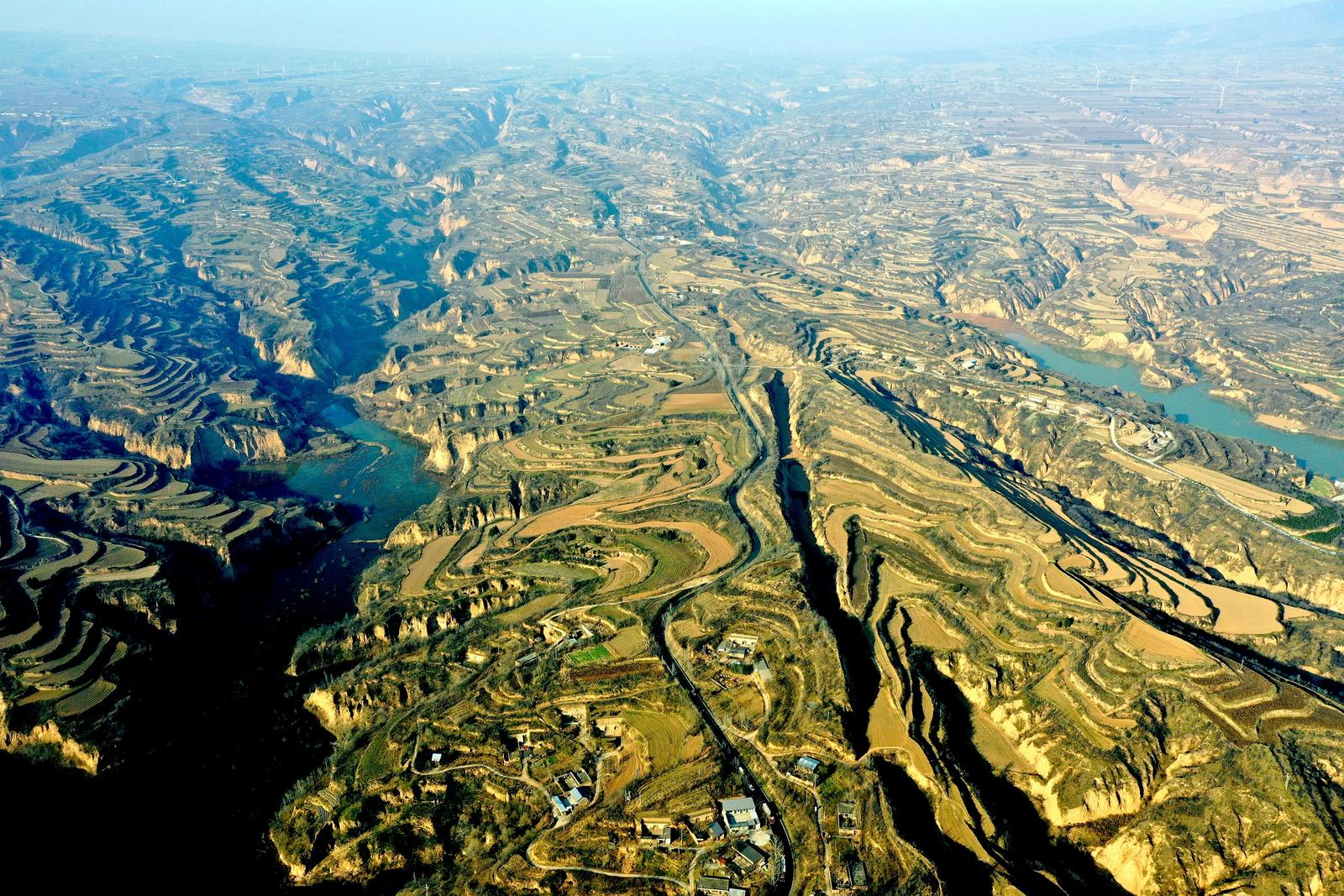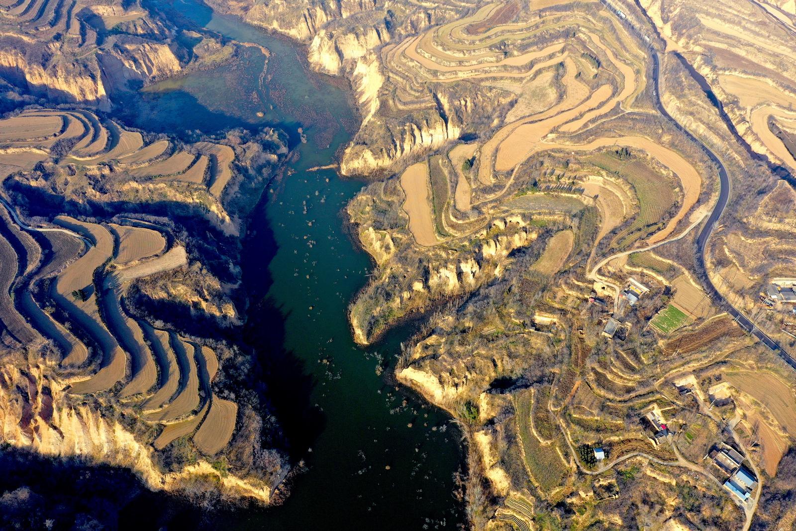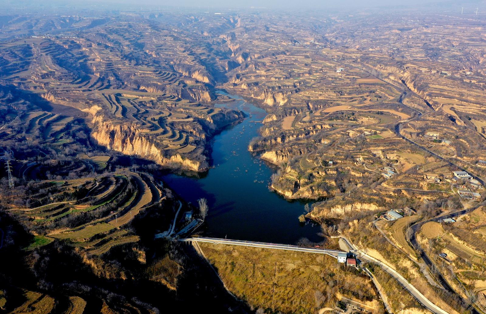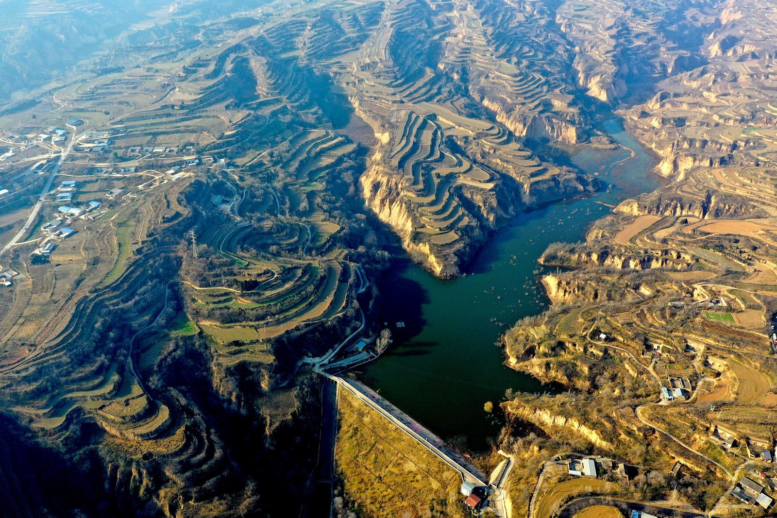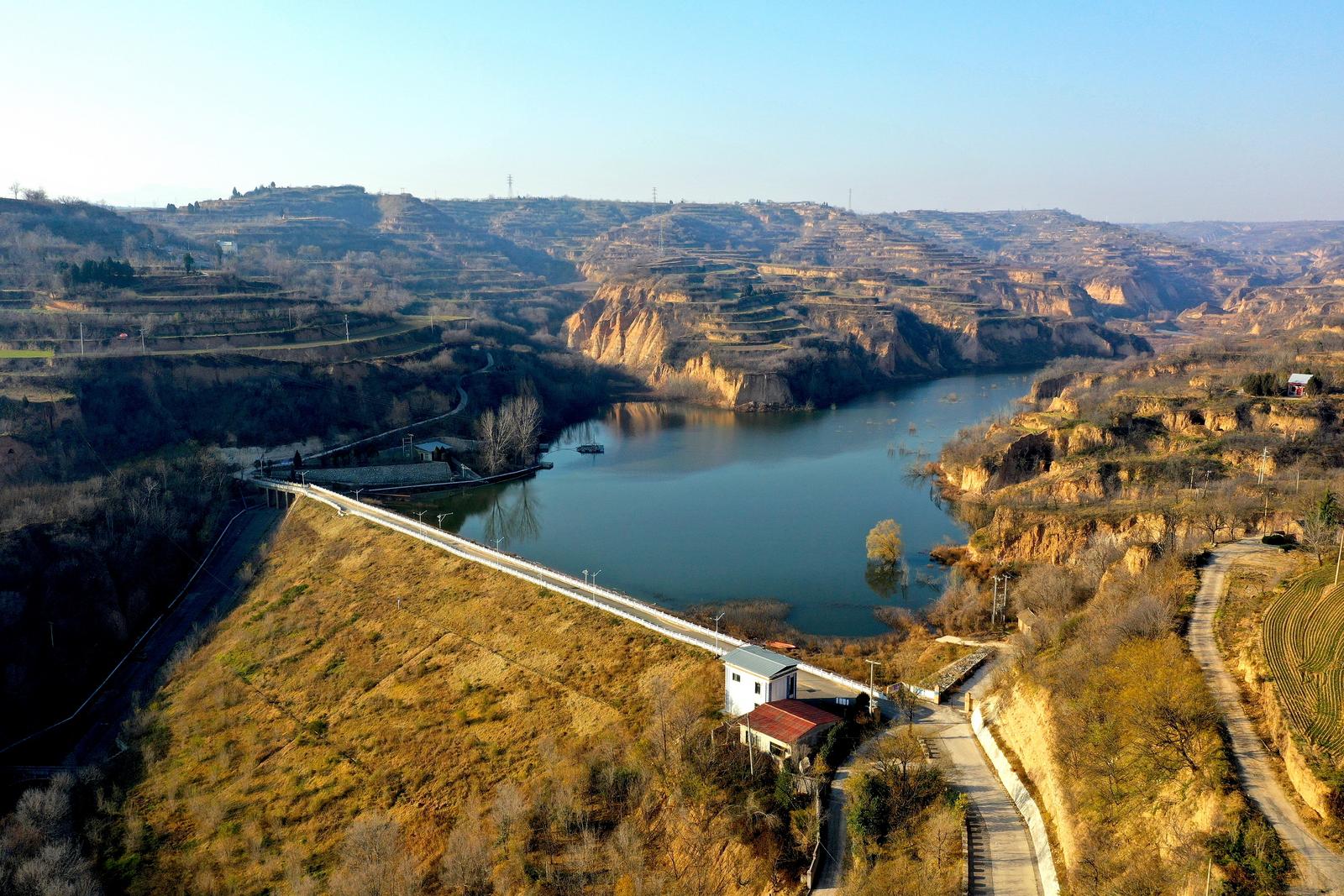 12月8日,山西省运城市平陆县红旗一库尽显诗意画卷。碧波荡漾的水面、散落的民居与蜿蜒的梯田相映成趣,宛如一幅流动的水墨丹青,美不胜收。