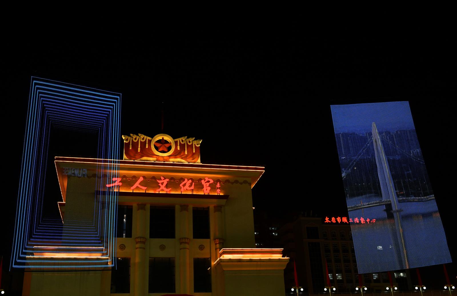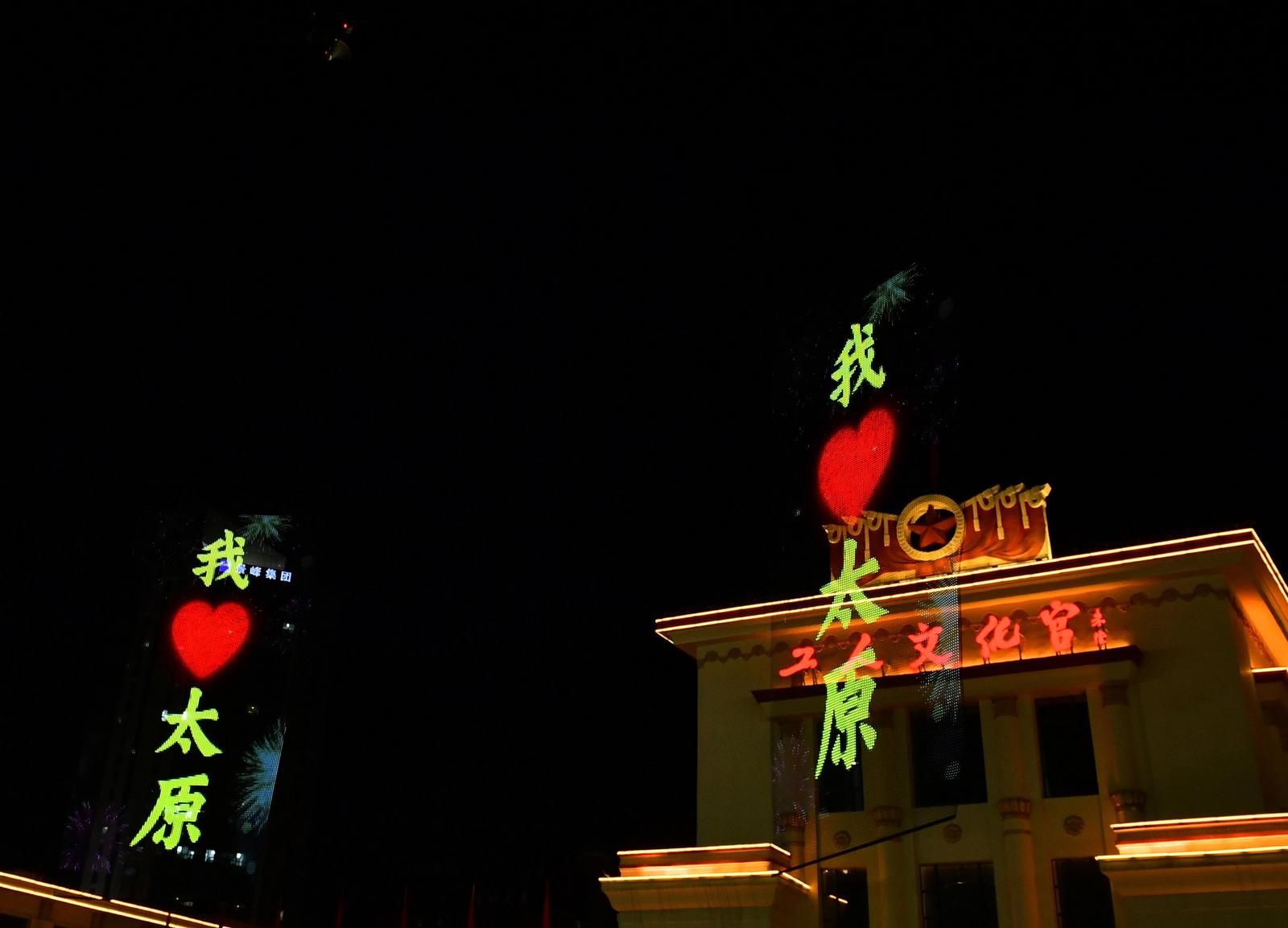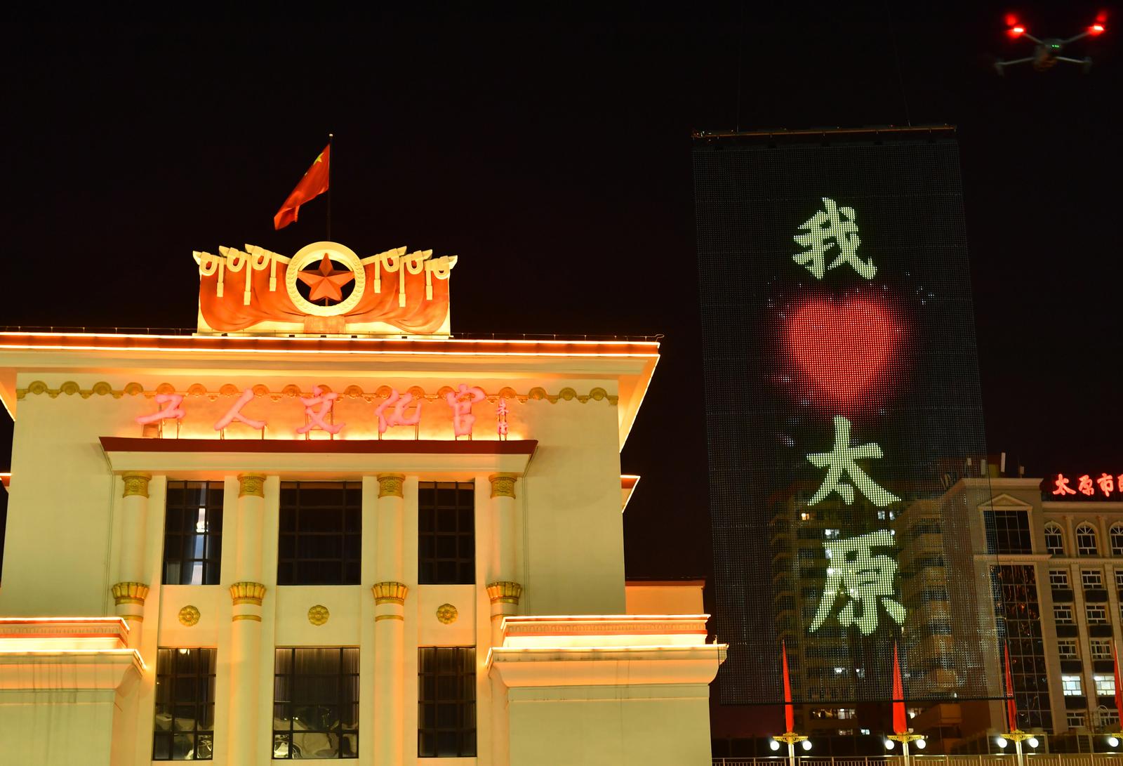12月8日晚,太原市南宫广场上空,两块打着“我爱太原”大字的飞天屏,在无人机的“助力”下“悬浮”于夜空,绚丽的色彩吸引了众多市民的眼球。