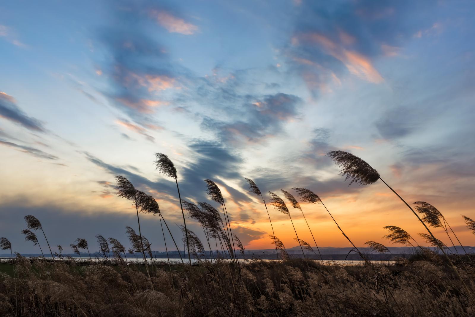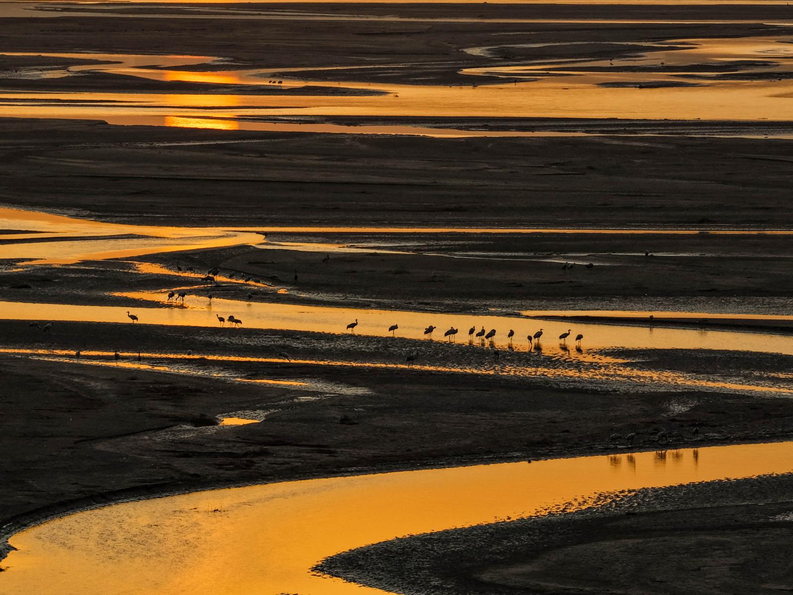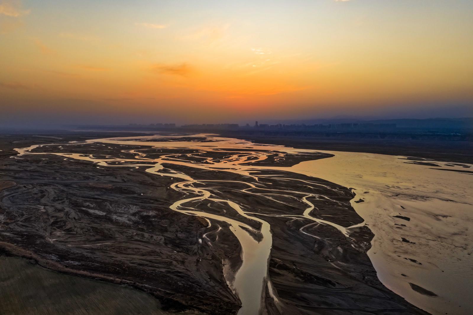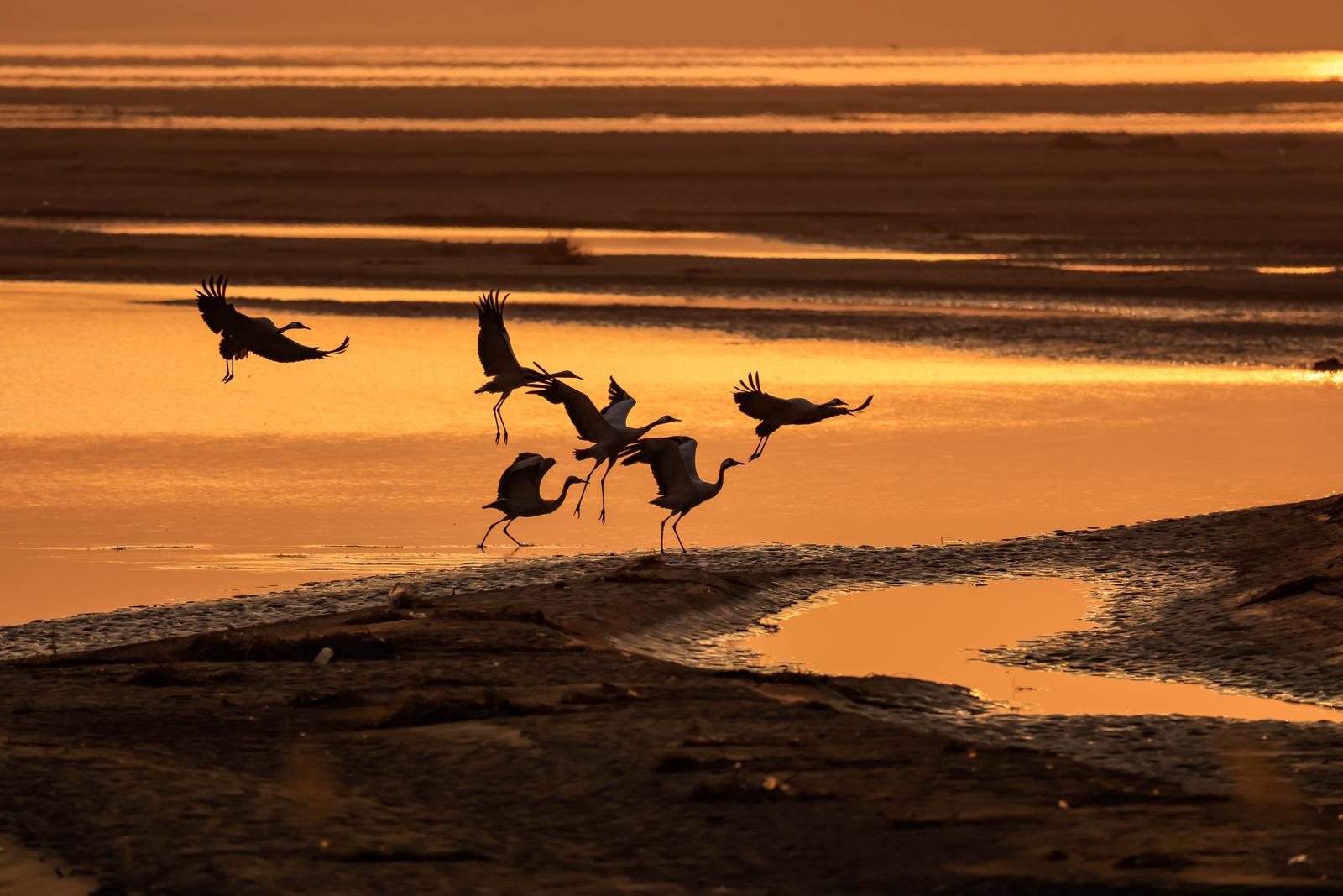 12月9日晚,黄河湿地山西河津段,夕阳余晖洒落在水面上,波光粼粼,成群的灰鹤在水中悠然自得。晚霞、飞鸟、芦苇相互映衬,构成一幅静美的生态画卷,美不胜收,令人陶醉。