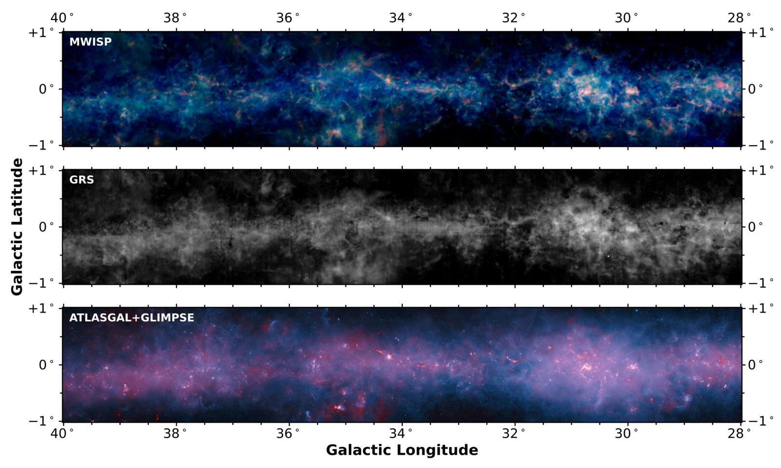 银纬±1度范围内银河画卷巡天与其它巡天的比较图。上图是银河画卷C18O、13CO和12CO(1—0)合成的RGB三色图,表征不同密度的分子气体环境;中图是GRS巡天的13CO(1—0)积分强度图;下图展示了ATLASGAL(870微米,红色)和Spitzer GLIMPSE(24微米,蓝色)的合成图,主要展示银盘上尘埃的热辐射。