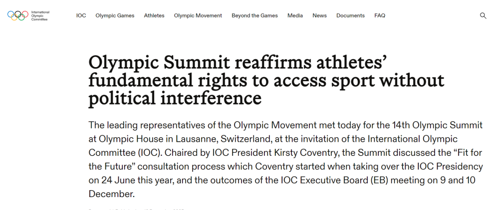 奥林匹克峰会是奥林匹克运动的高级别年度会议,与会代表围绕重大热点问题交流,为国际奥委会决策提供建议。今年的奥林匹克峰会涵盖米兰-科尔蒂纳冬奥会、达喀尔青奥会、洛杉矶奥运会、反兴奋剂工作等议题。