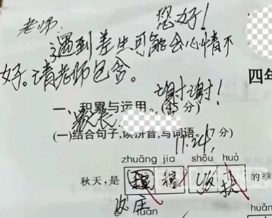 “老师您好!遇到差生可能会心情不好,请老师包含(应为涵),谢谢!”据光明日报微信公众号报道,近日,湖北一名四年级学生的语文小测验拿了44分,爷爷在孩子试卷上写下了这句留言。对此,老师回应说,孩子父母都在外地打工,成绩不太理想,平时也有点调皮,“但这个留言让我非常感动,被家长的善意打动了”。