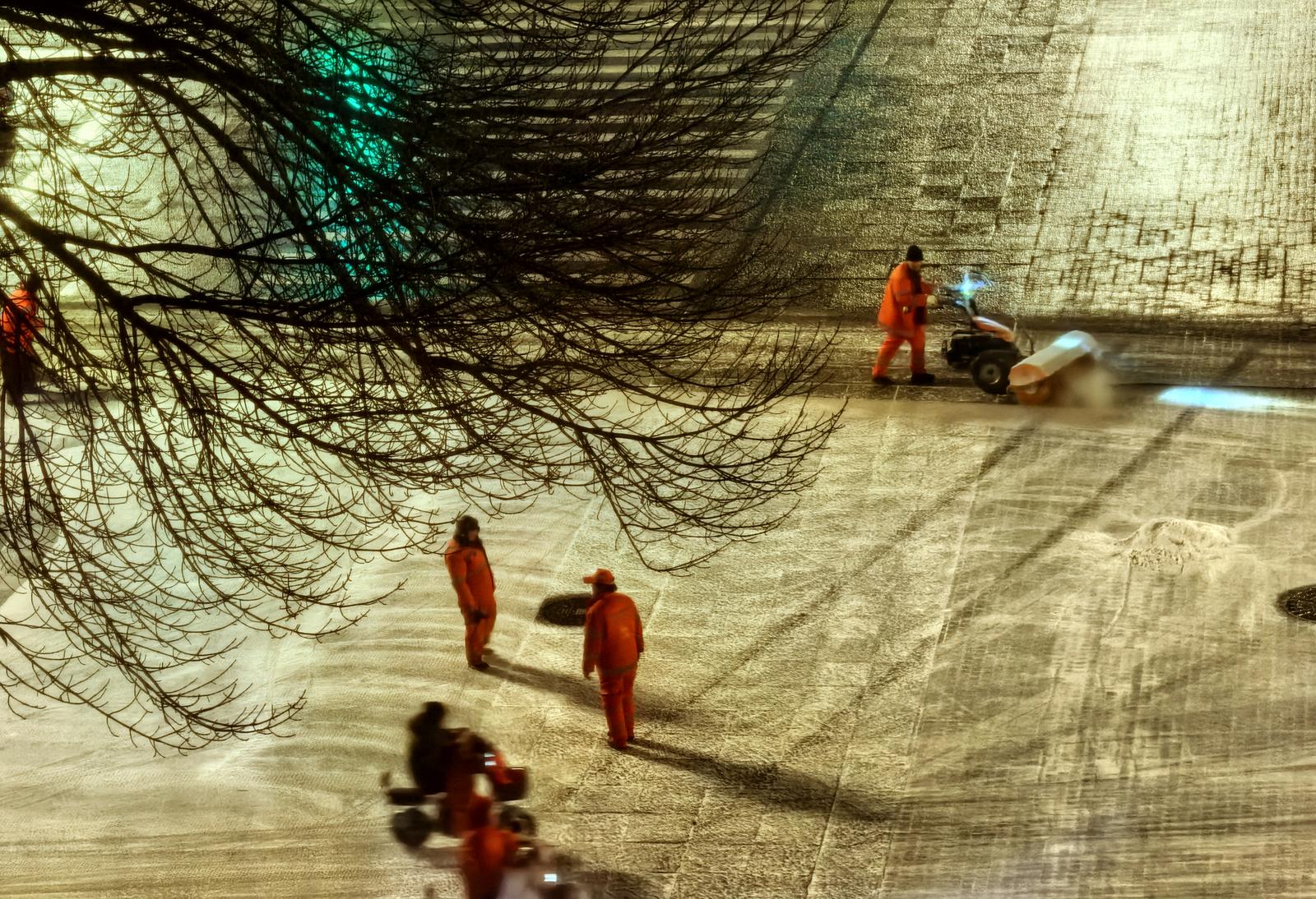 太原迎泽大街,环卫工人在晨光中进行清雪作业。刘胜 摄