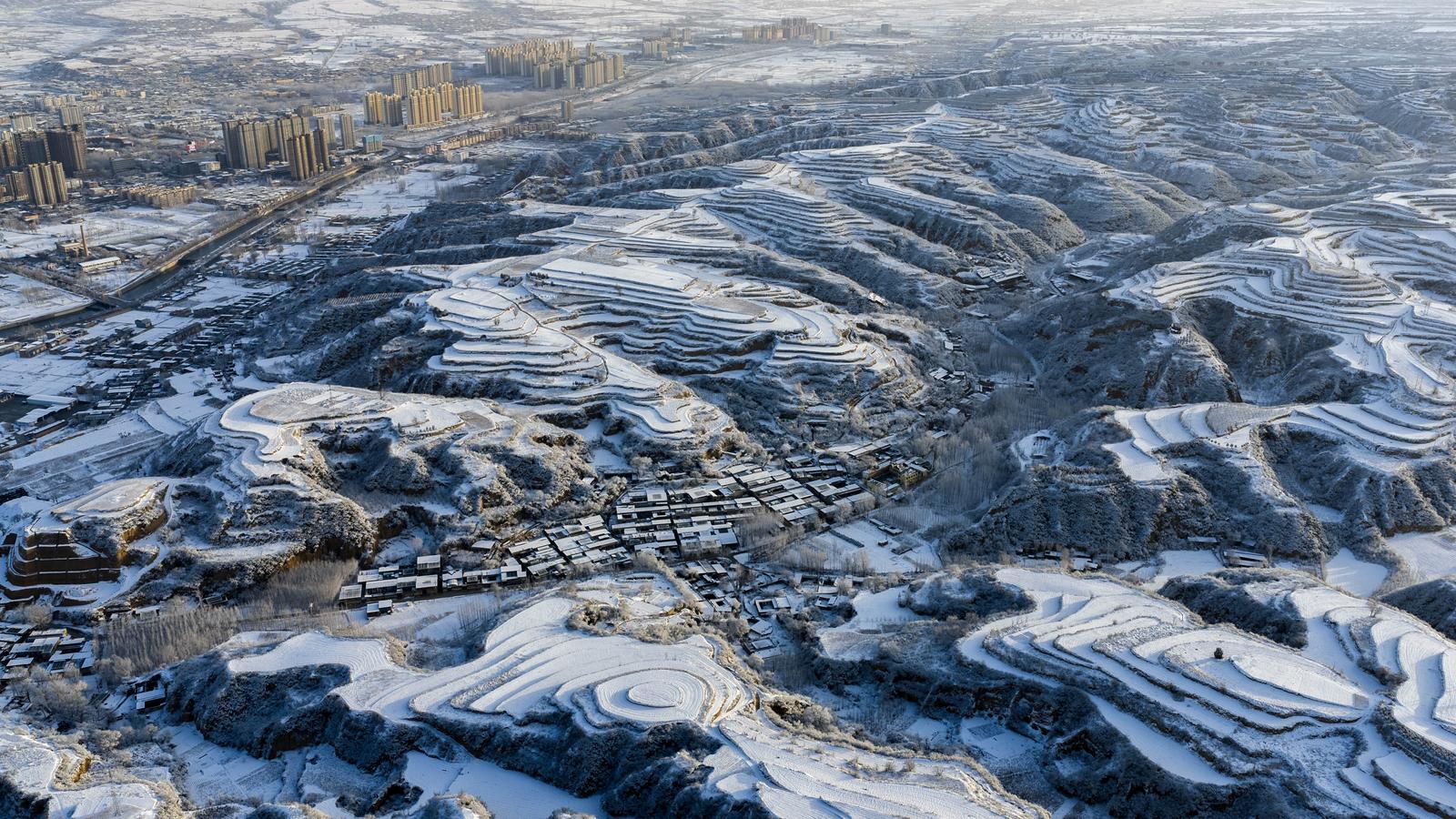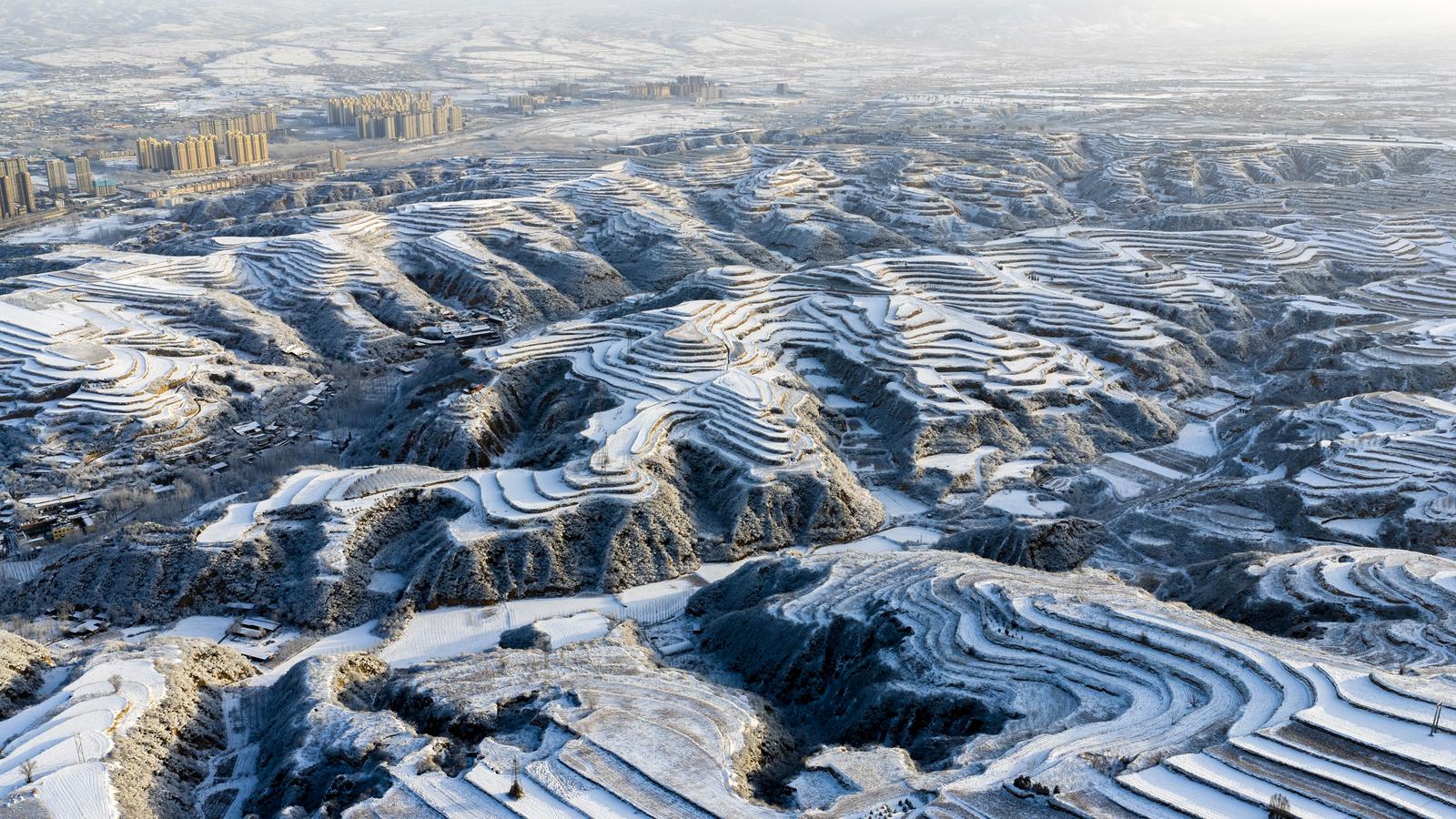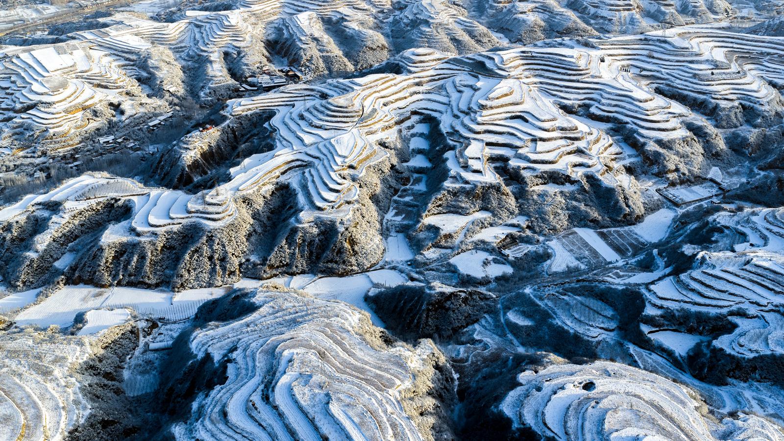 12月14日,山西省临汾市霍州市梯田在白雪的覆盖下,呈现出如梦似幻的壮美景象,宛如大地镌刻的精美指纹,线条流畅,层次分明。