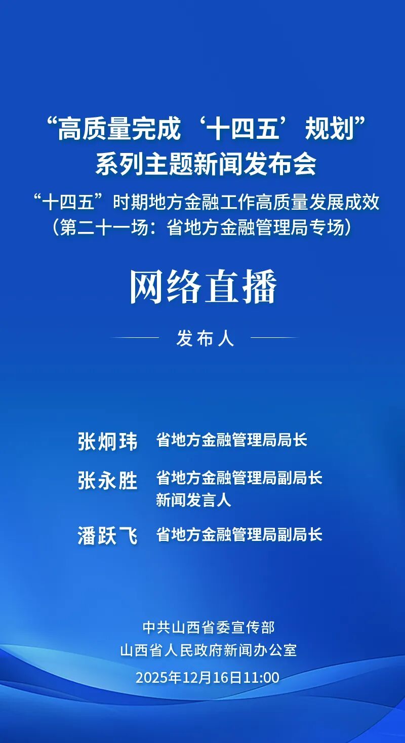 2025年12月16日上午11时,中共山西省委宣传部、山西省人民政府新闻办公室将举行“高质量完成‘十四五’规划”系列主题第二十一场新闻发布会。省地方金融管理局有关负责同志将介绍“十四五”时期地方金融工作高质量发展成效,并答记者问。山西发布微信视频号、微博将进行网络视频直播。
