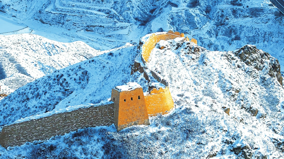 12月13日,雪后的广武长城宛如一条巨龙盘旋在山脊之间,呈现出沧桑壮美的独特景观。(李日明 史振宇摄)