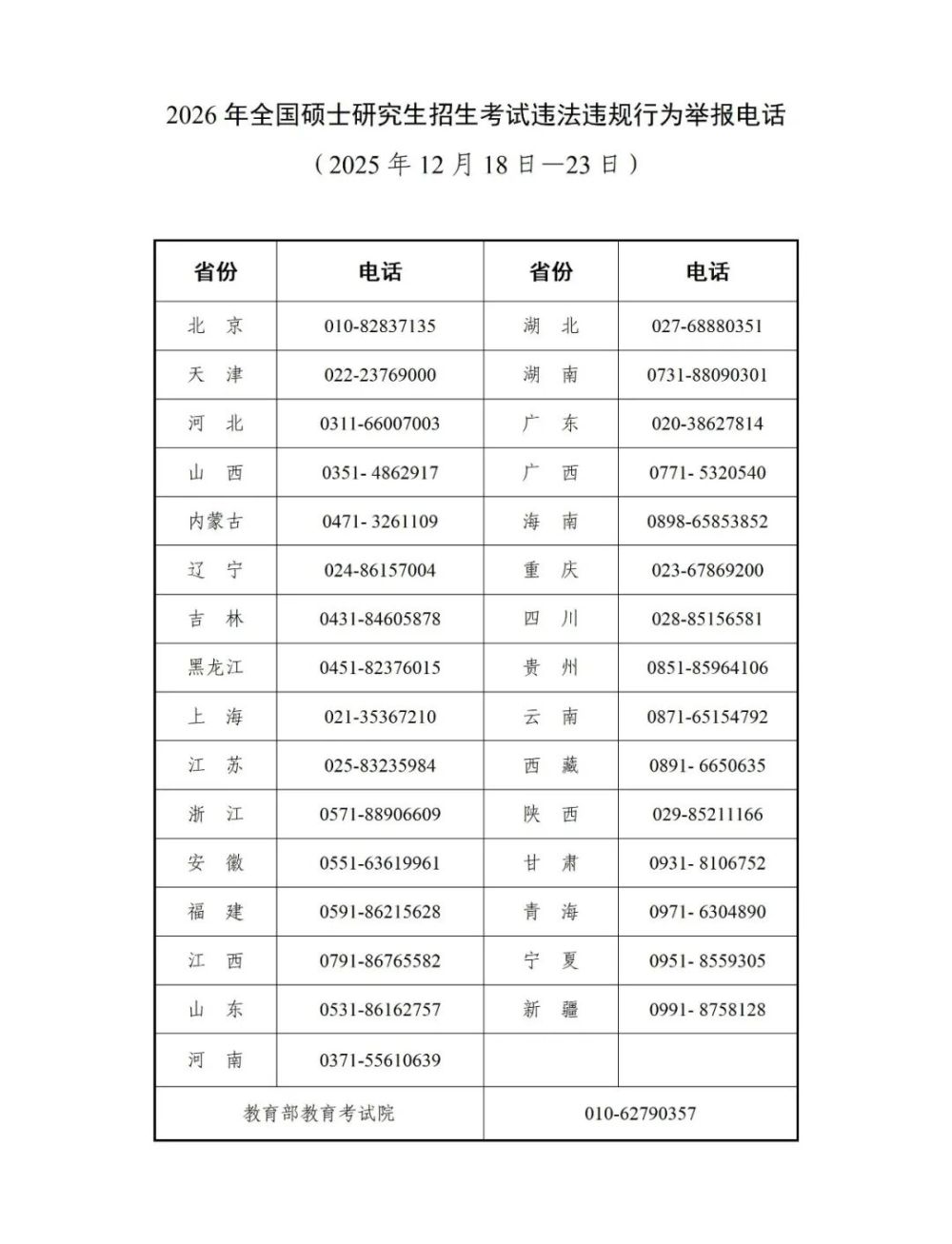 现向社会公布2026年全国硕士研究生招生考试违法违规行为举报电话,欢迎广大考生和公众参与监督。
