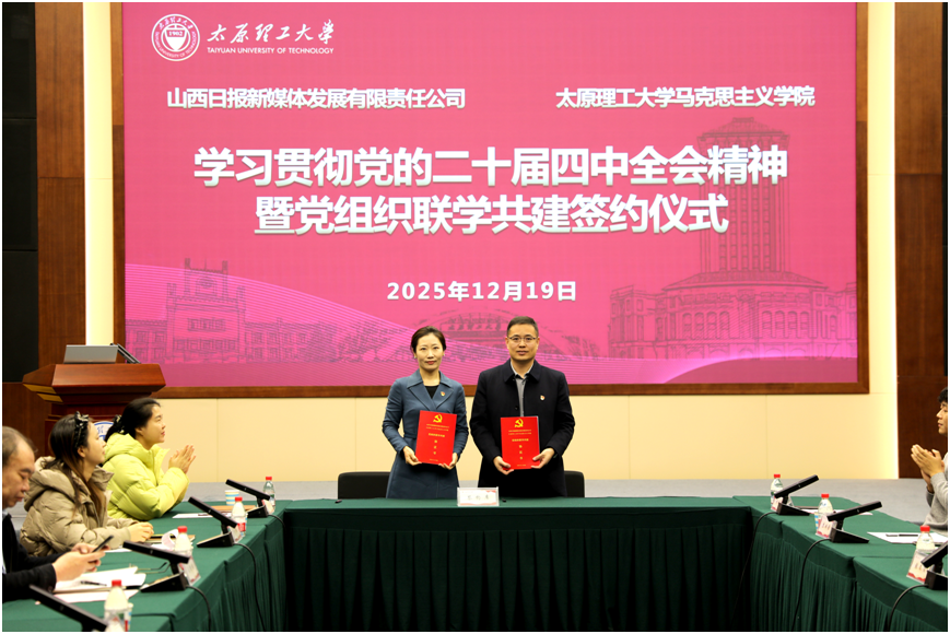 12月19日,太原理工大学明向校区鹏飞会堂暖意融融,山西日报新媒体发展有限责任公司与太原理工大学马克思主义学院学习贯彻党的二十届四中全会精神暨党组织联学共建签约仪式在这里举行。双方相关领导、党员代表齐聚一堂,共话党建合作,共学全会精神。