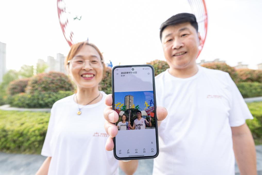 4月14日,浙江省湖州市南太湖新区外庄公园“运动加油站”,张氏夫妻展示他们2023年9月参与体重管理时的照片。他们表示,坚持运动多年后,两人都实现了减重30斤以上的目标。