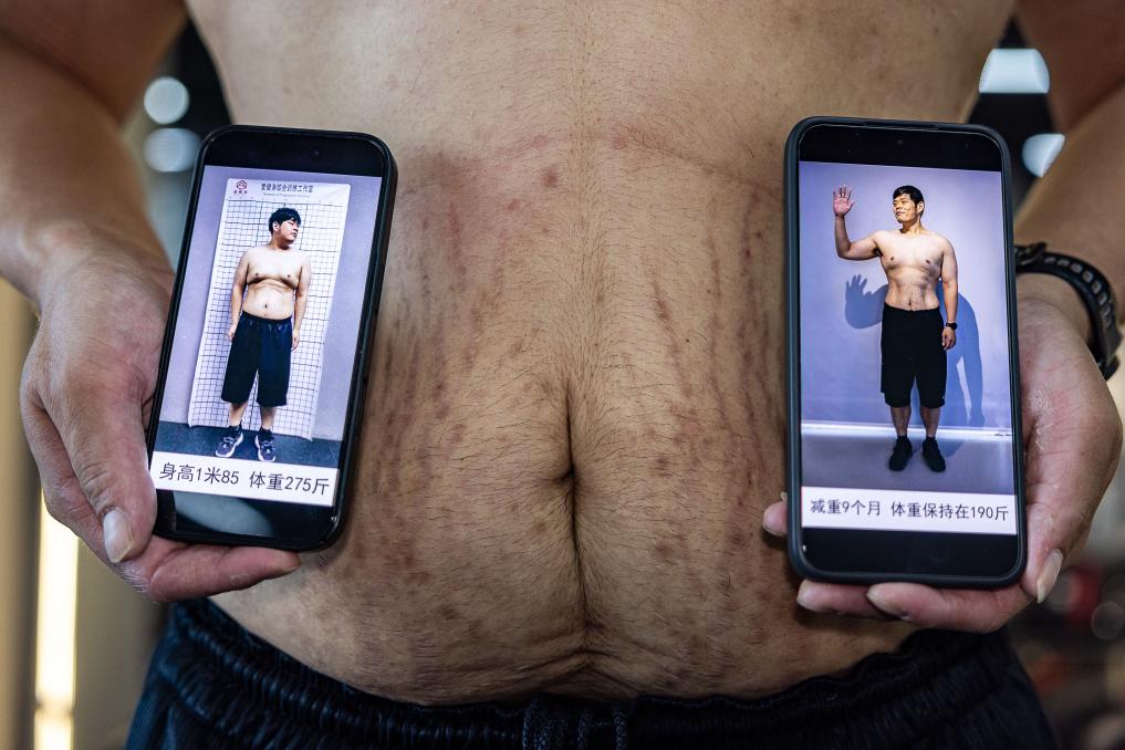 11月5日,在浙江省湖州市爱山街道一体能综合训练工作室,张沛然展示自己的减重成果。照片中,减重成功的他,在向过去的自己“挥手告别”。