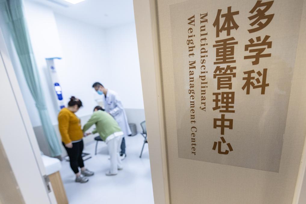 3月20日,在浙江省湖州市中心医院开设的“体重门诊”,医师给首批就诊患者测量腰围、体重、身高等数据。