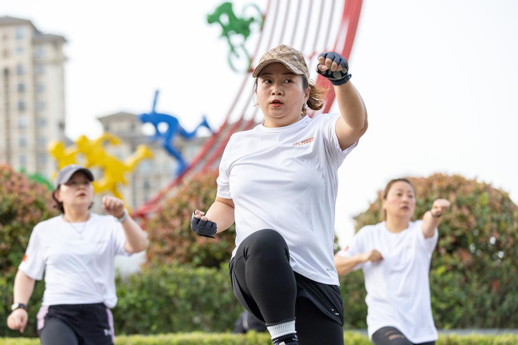 4月14日,浙江省湖州市南太湖新区外庄公园“运动加油站”,市民在朝阳下运动,追求健康生活。
