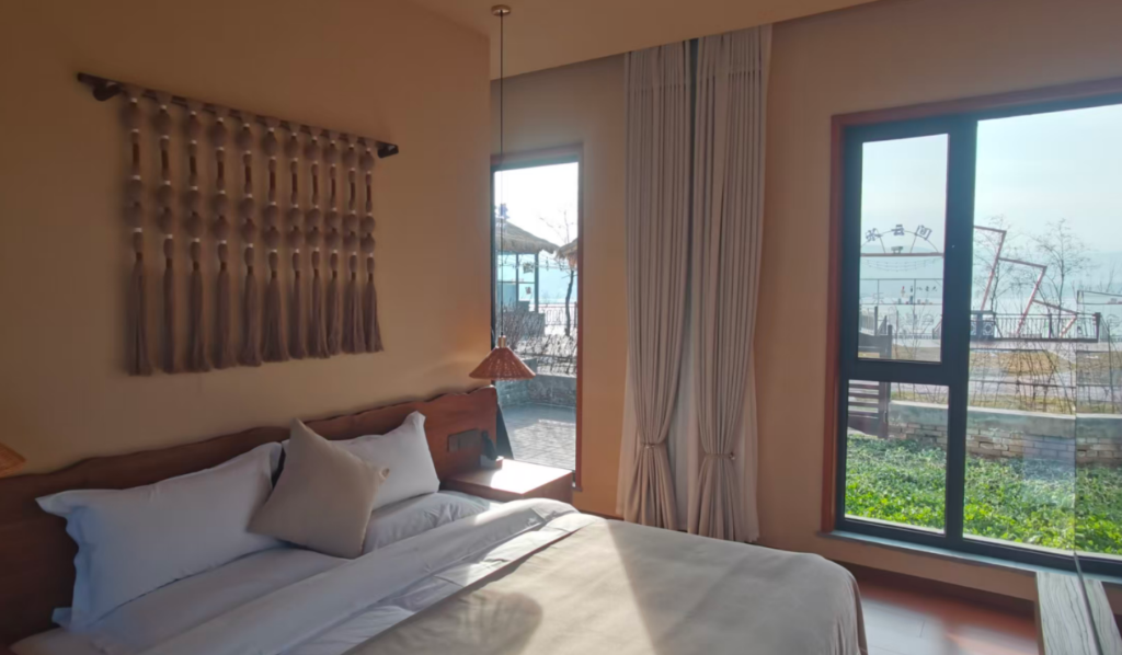 走进郭庄水库旁的水云间民宿,青砖黛瓦、环境雅致,27间客房风格迥异,陈设兼具乡土韵味与现代舒适感。