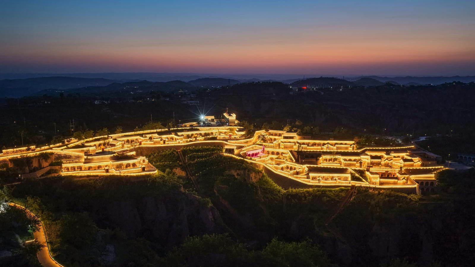 吕梁市离石区枣林乡传统村落彩家庄从高空俯瞰,傍晚时分彩家庄如明珠般嵌在大山里。张杰摄