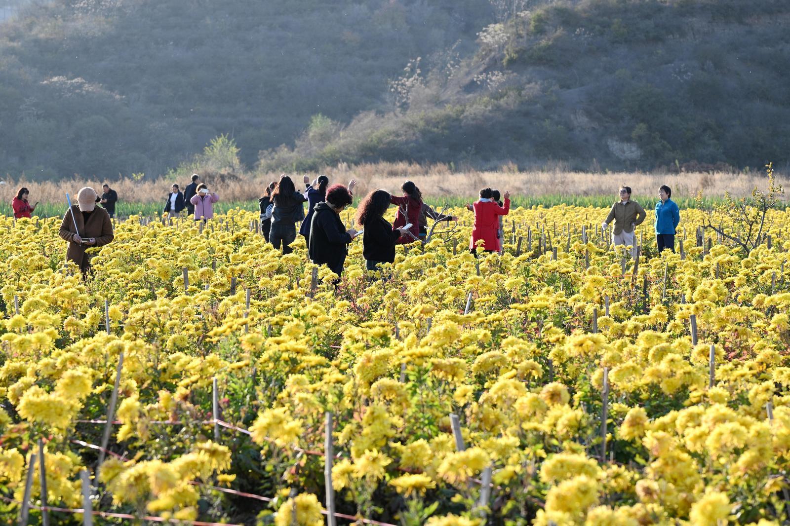 11月3日,阳泉市平定县杨家沟菊园内,满园菊花盛开,不少游客前来打卡 。刘胜摄