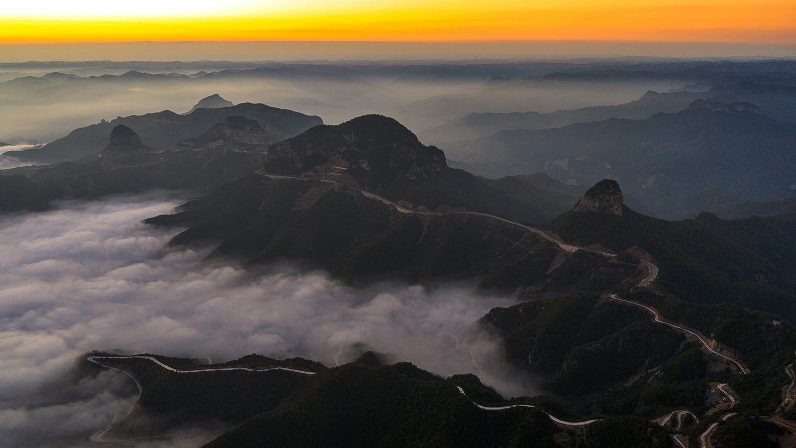 太行一号旅游公路古郊乡马武寨段从高空俯瞰,天光与薄雾相融,景色壮观。王建军摄